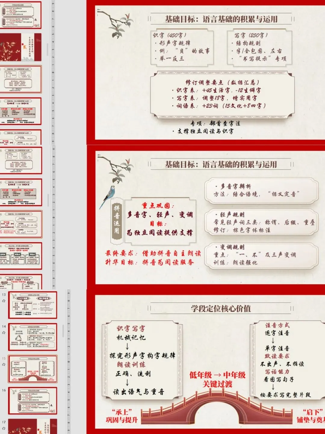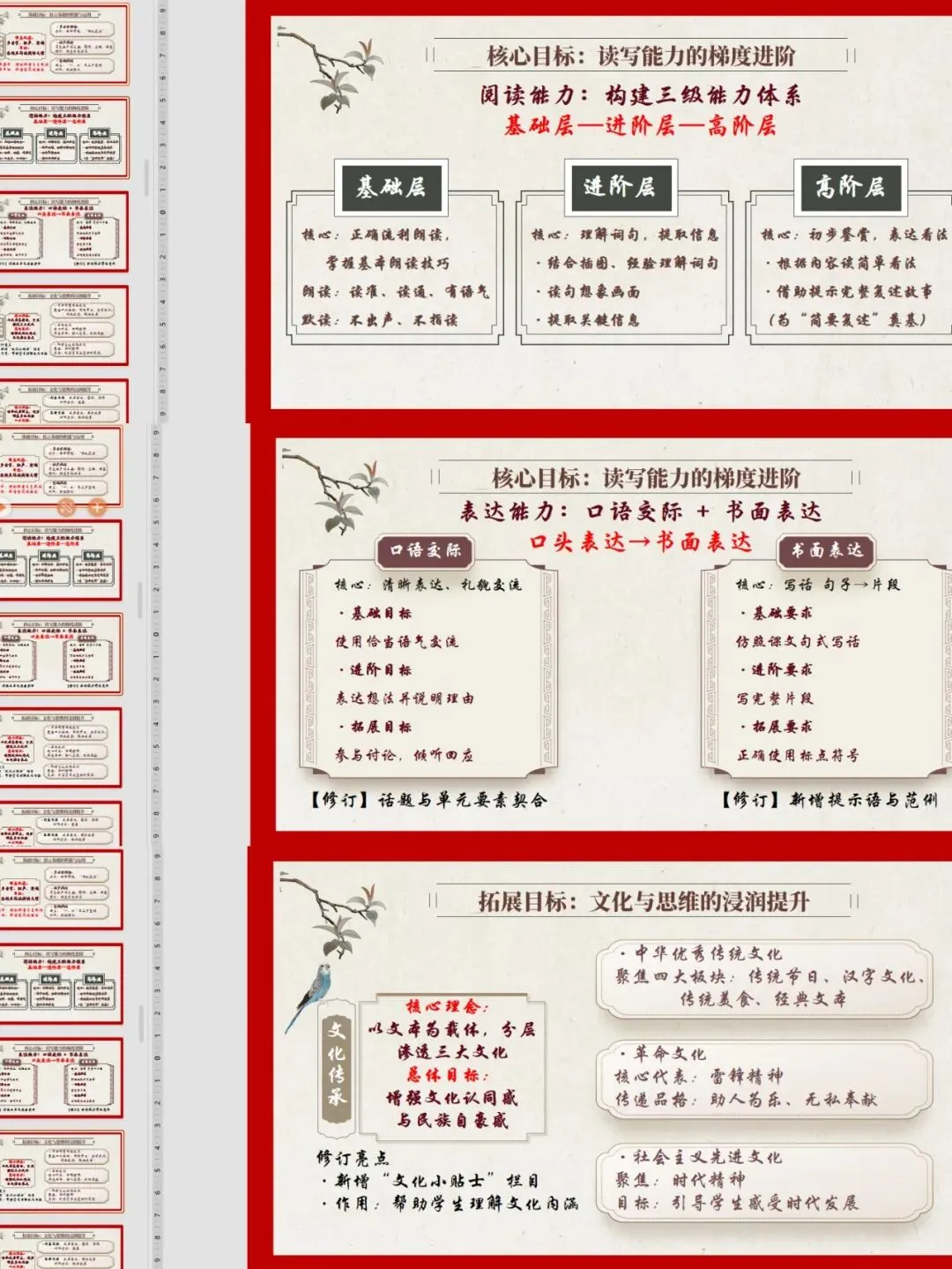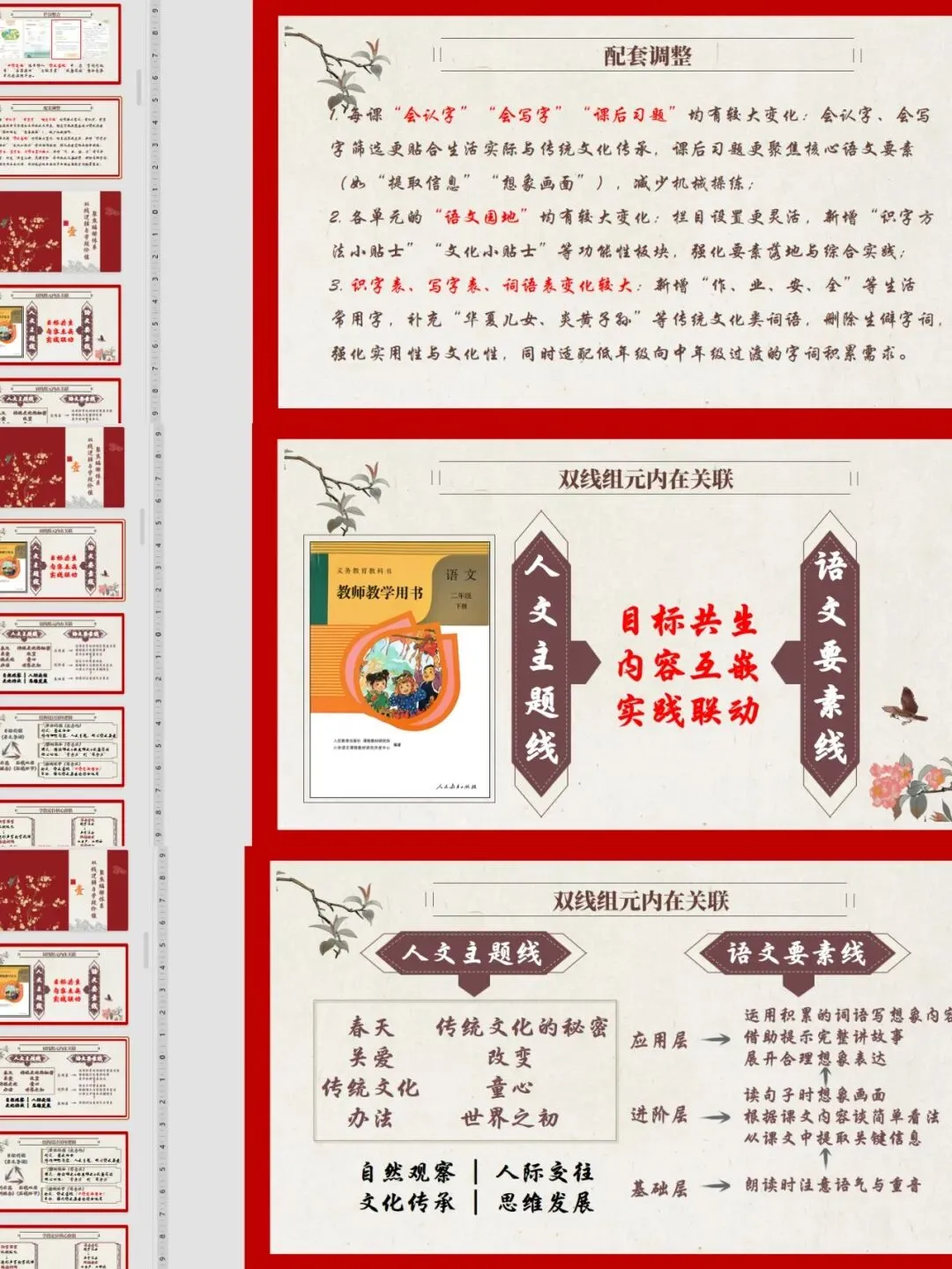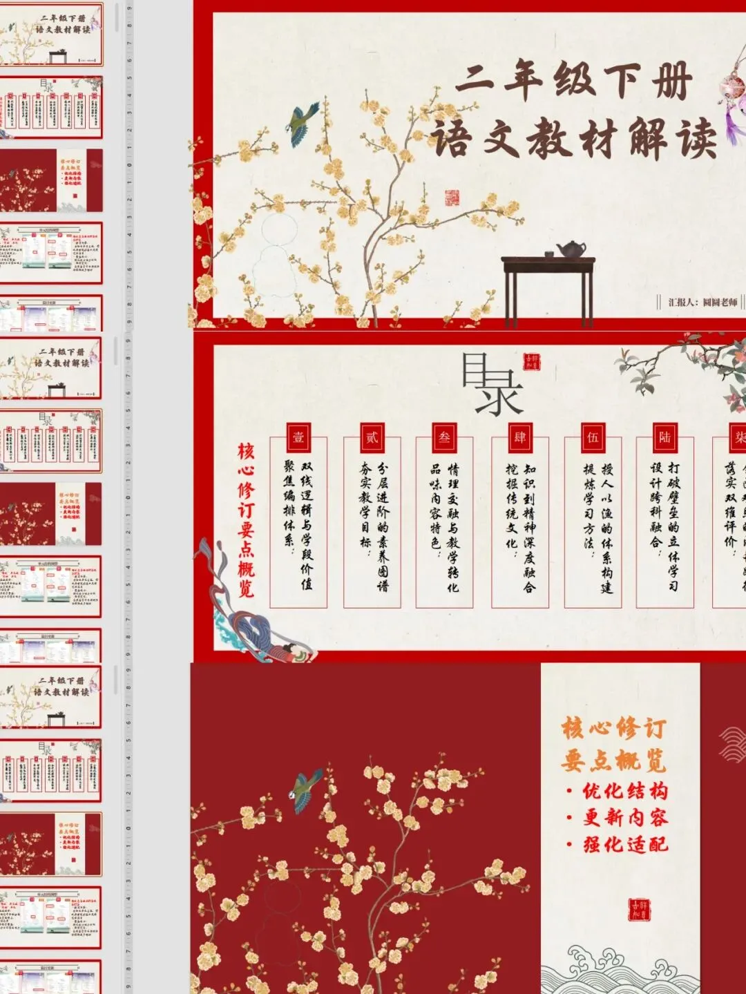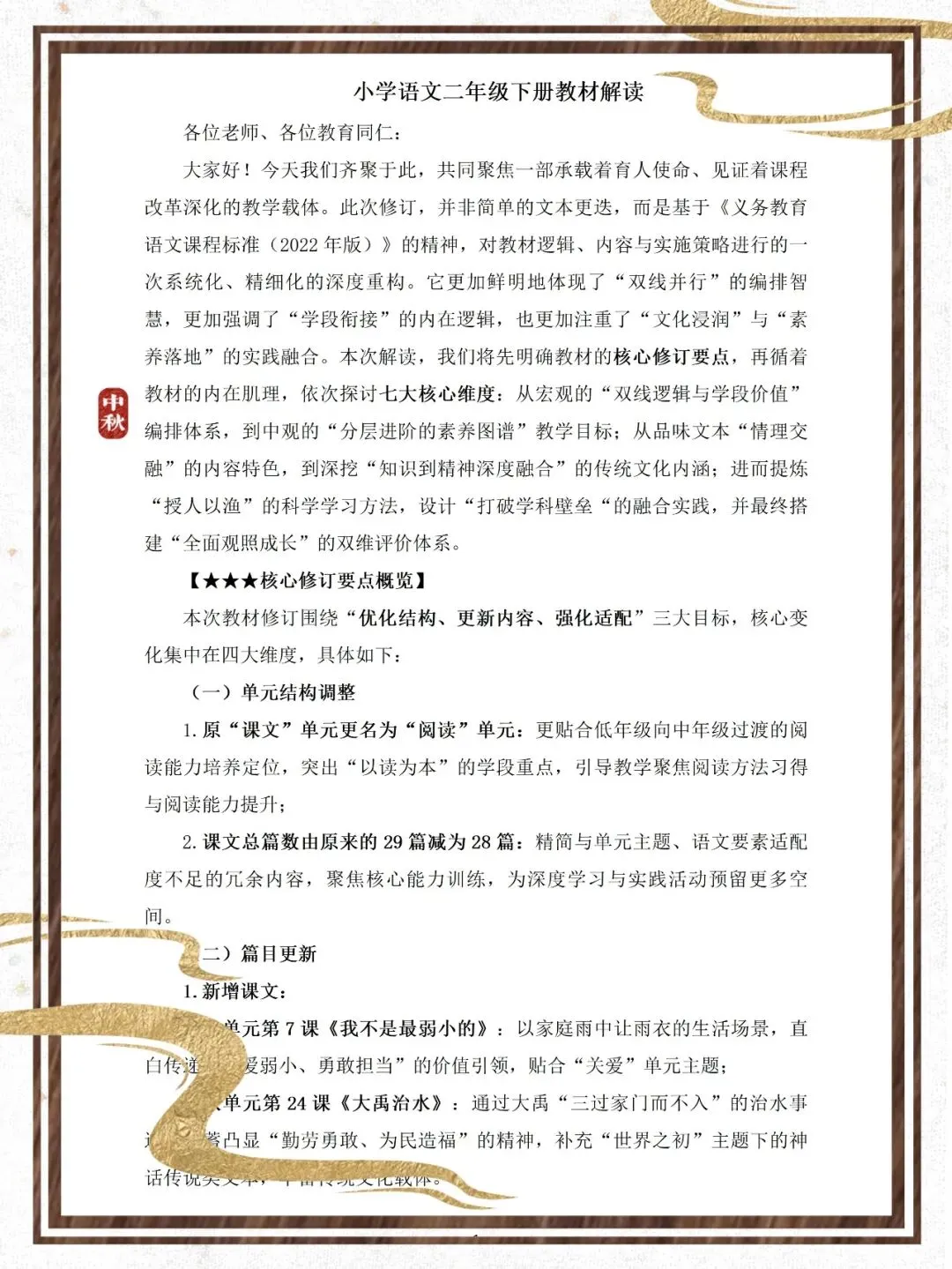 大家好!今天我们齐聚于此,共同聚焦一部承载着育人使命、见证着课程改革深化的教学载体。此次修订,并非简单的文本更迭,而是基于《义务教育语文课程标准(2022年版)》的精神,对教材逻辑、内容与实施策略进行的一次系统化、精细化的深度重构。它更加鲜明地体现了“双线并行”的编排智慧,更加强调了“学段衔接”的内在逻辑,也更加注重了“文化浸润”与“素养落地”的实践融合。本次解读,我们将先明确教材的核心修订要点,再循着教材的内在肌理,依次探讨七大核心维度:从宏观的“双线逻辑与学段价值”编排体系,到中观的“分层进阶的素养图谱”教学目标;从品味文本“情理交融”的内容特色,到深挖“知识到精神深度融合”的传统文化内涵;进而提炼“授人以渔”的科学学习方法,设计“打破学科壁垒“的融合实践,并最终搭建“全面观照成长”的双维评价体系。