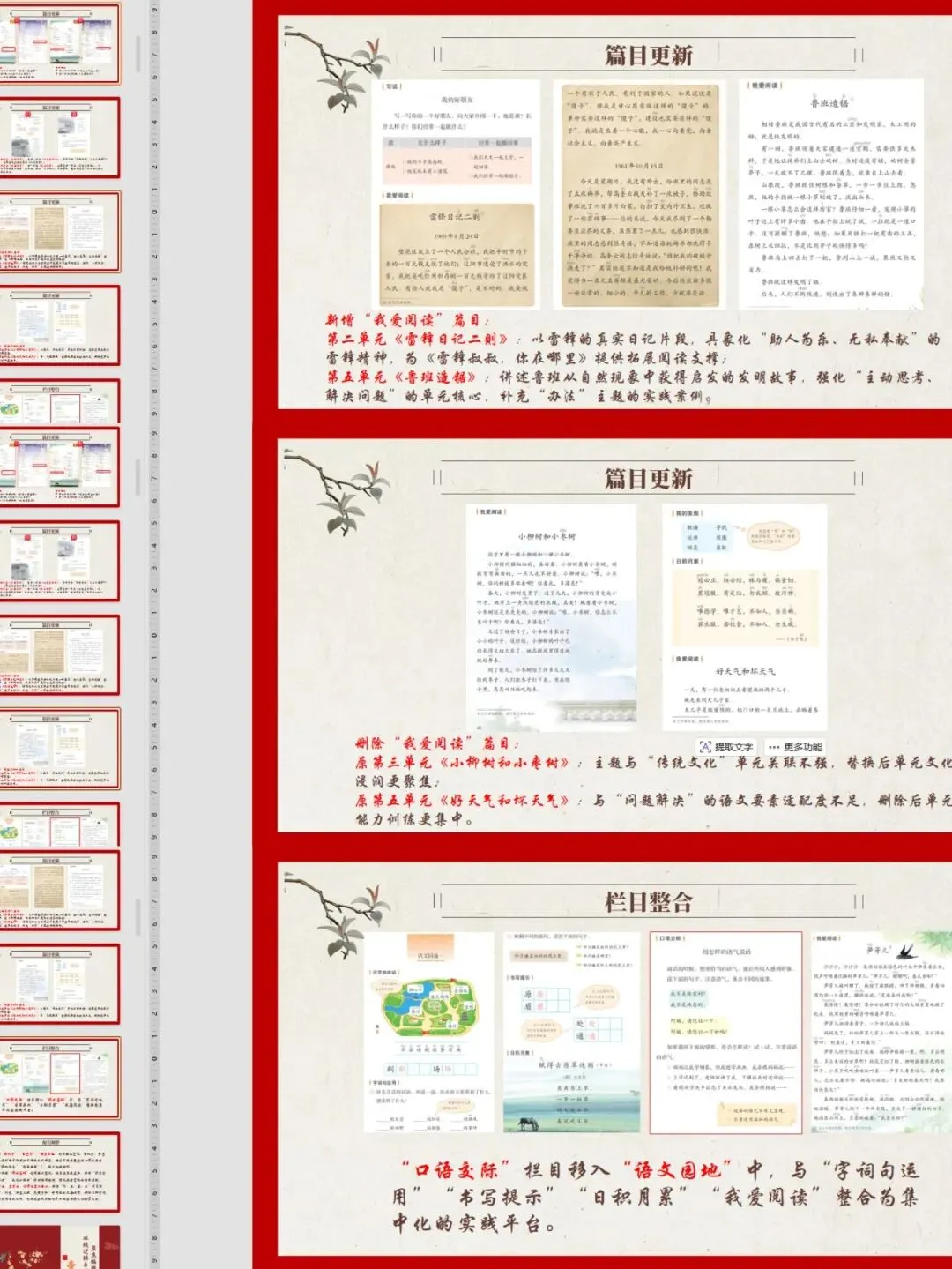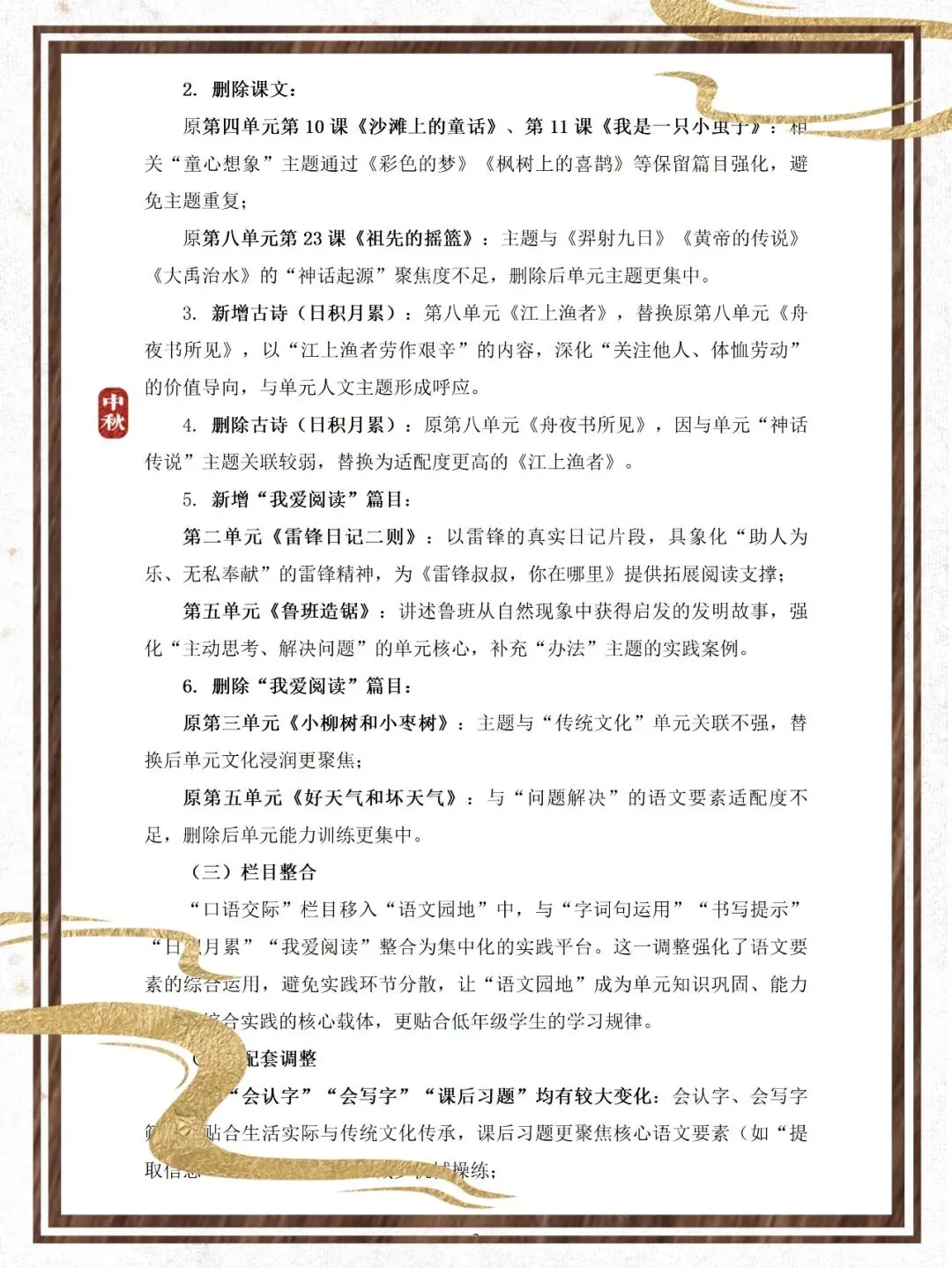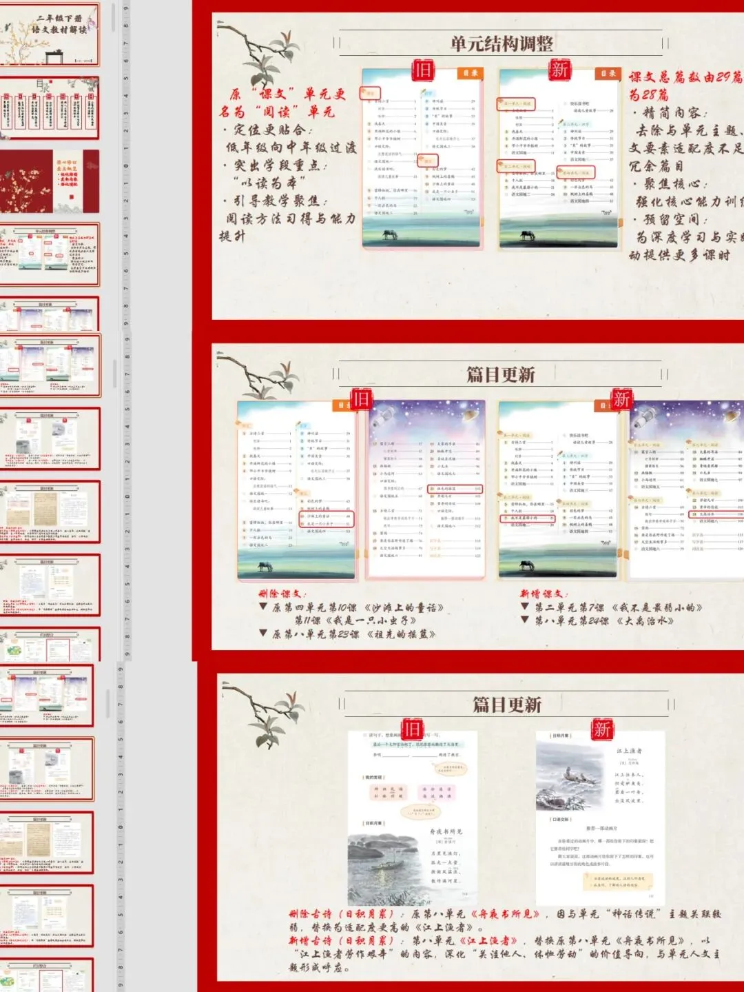 2.课文总篇数由原来的29篇减为28篇:精简与单元主题、语文要素适配度不足的冗余内容,聚焦核心能力训练,为深度学习与实践活动预留更多空间。