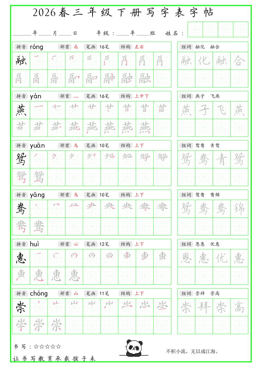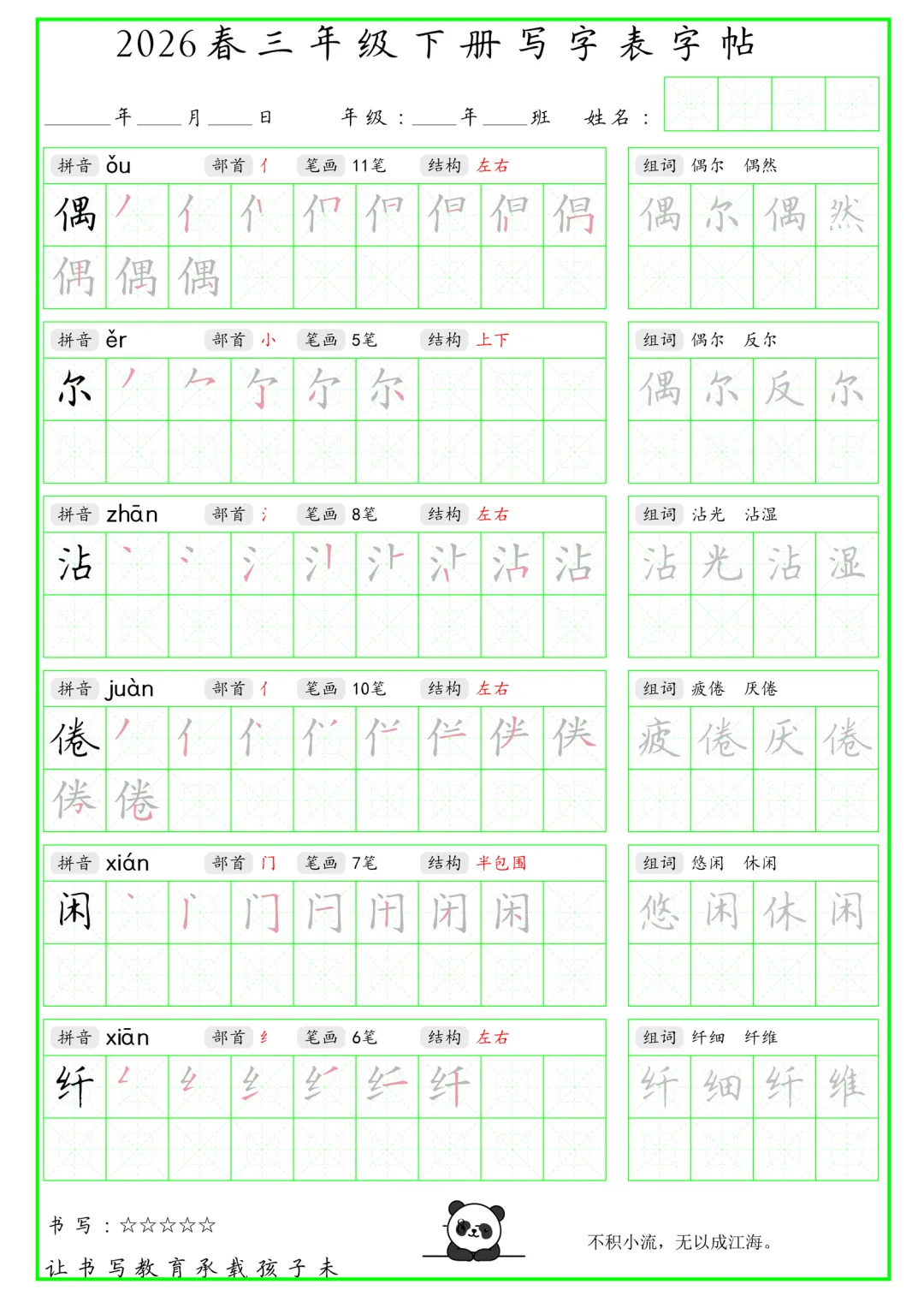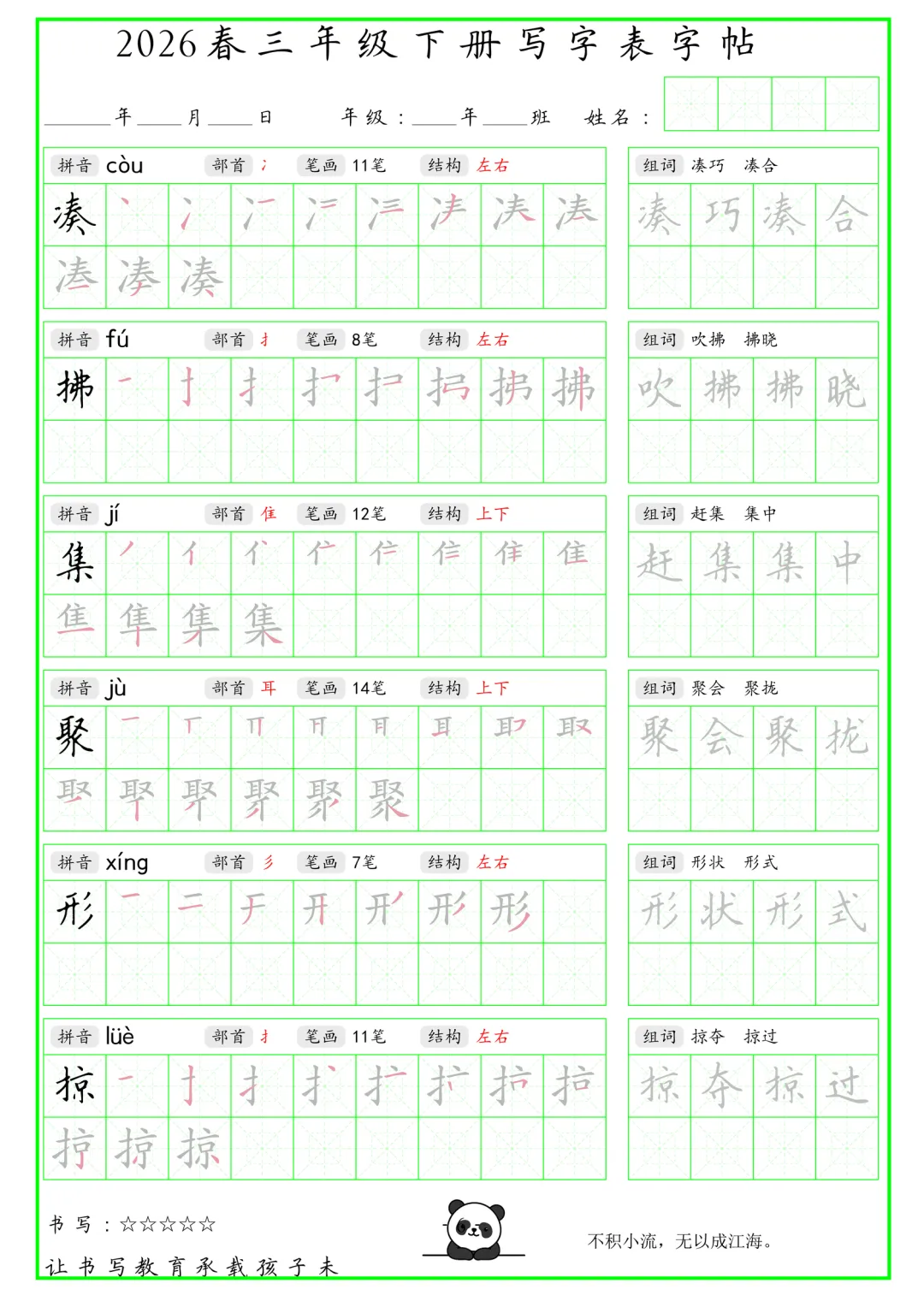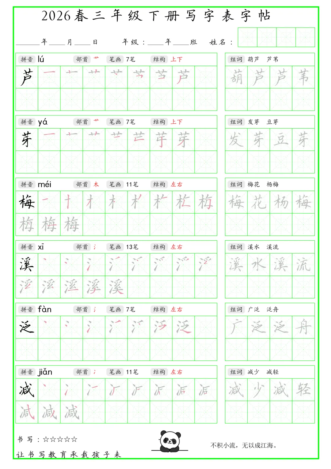 大家好,我是石头老师,每天持续分享更多优质学习资源。今天和大家分享的是2026年春小学三年级语文下册写字表字帖绿色版电子版可打印练习,内容含生字、拼音、笔画笔顺、组词、结构部首等,同步课本生字词,有助于预习下册生字,练习书写。