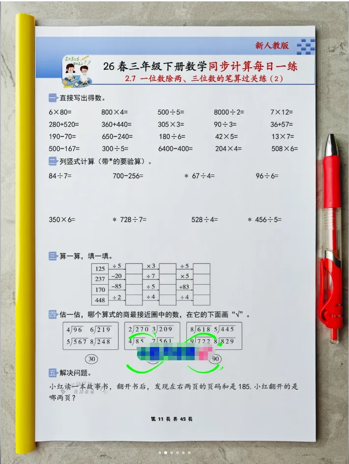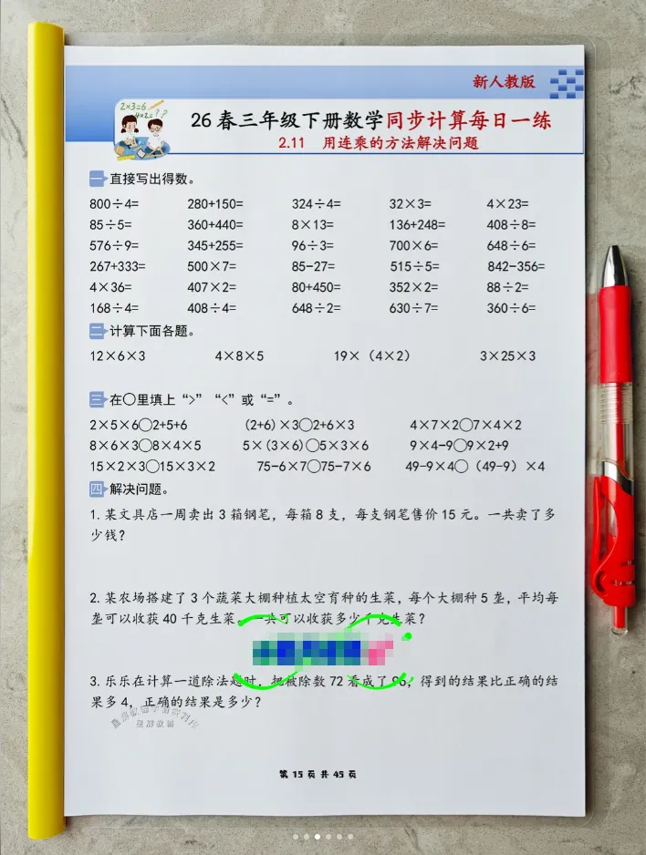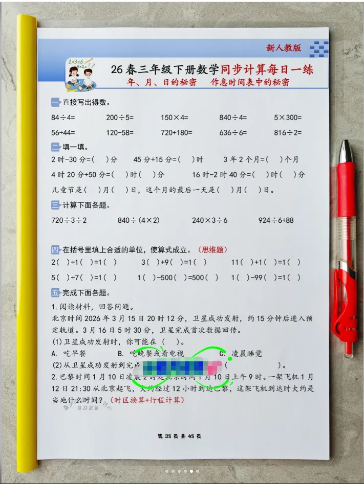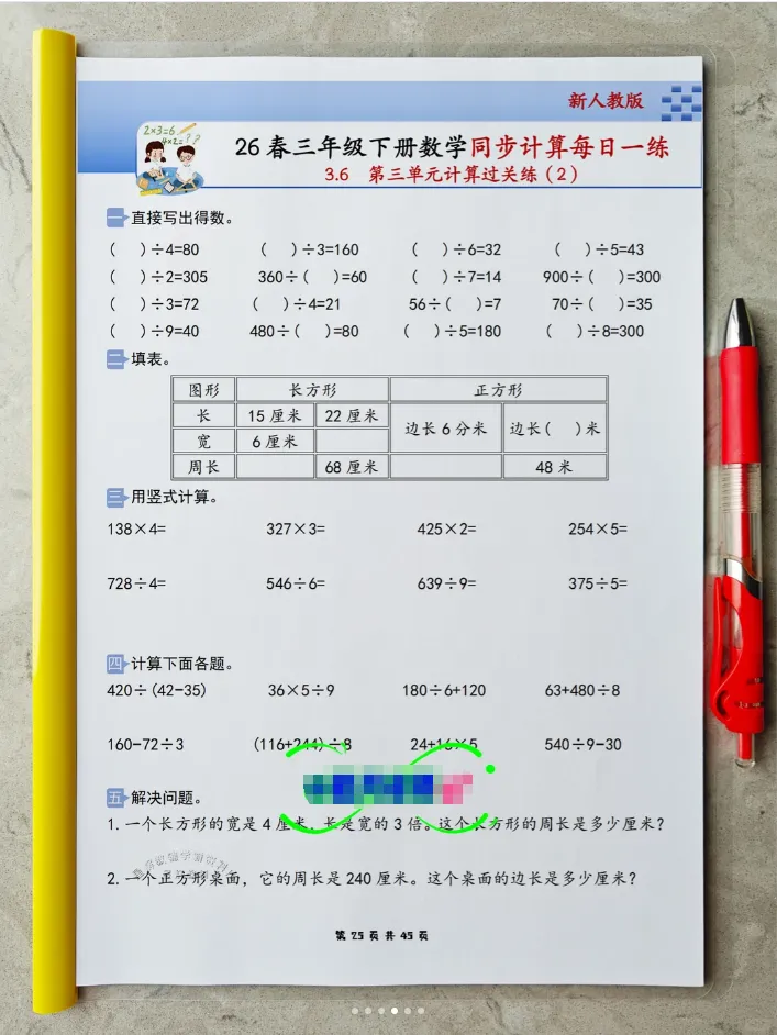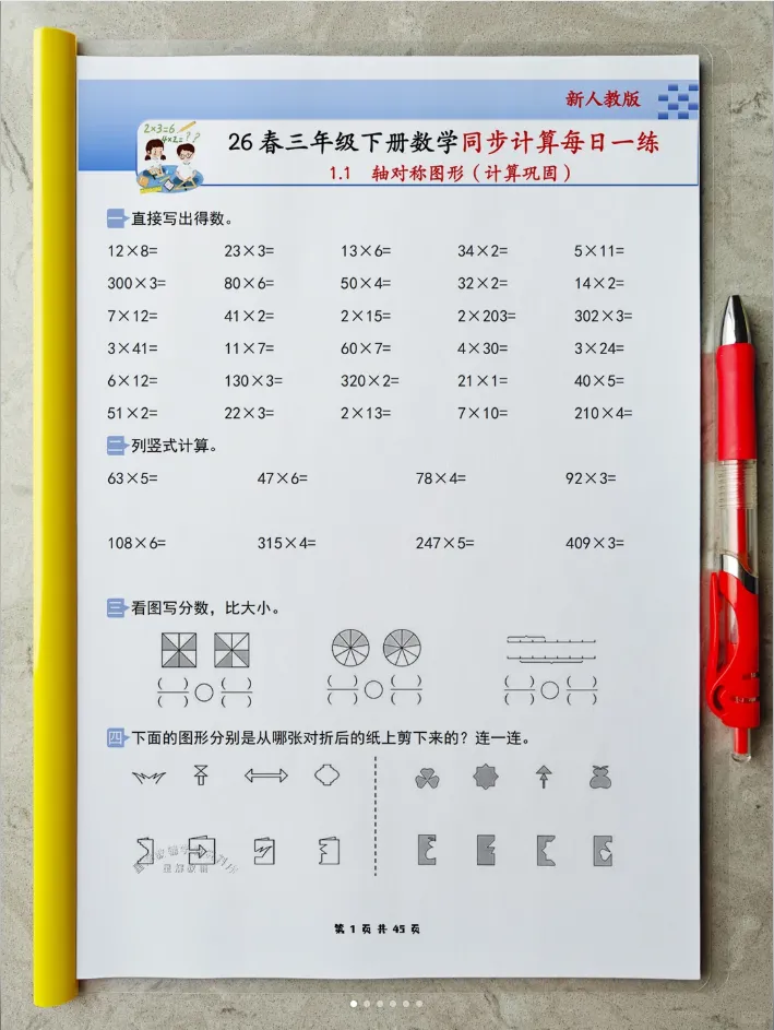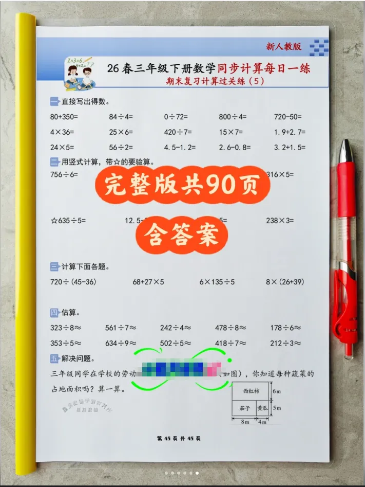 2026春人教版小学三年级下册数学同步《计算每日一练小纸条》全新首发,专为三年级中年级进阶阶段孩子量身打造,精准适配中年级数学计算能力提升需求,完全同步2026春人教版最新数学课本,以“同步课时、计算专项、每日一页、轻巧便携、高效提优”为核心,贴合三年级孩子的认知特点和校内教学进度,聚焦计算能力夯实、运算技巧提升与解题规范培养,是孩子课后同步计算练习、课前预习、查漏补缺、强化计算功底,家长轻松辅导,老师课堂计算辅助练习的超实用随身学习工具,让孩子每天花15-20分钟,专攻计算、稳扎稳打,轻松提升计算准确率与速度,为中年级数学综合进阶筑牢核心根基。