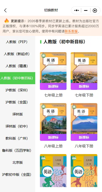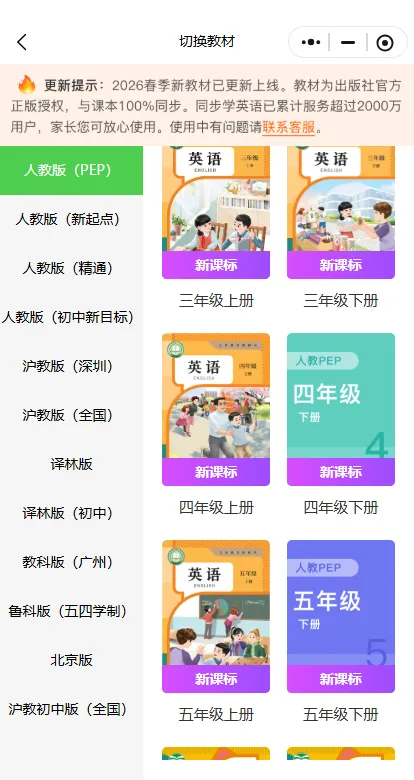 同学们好,【同步学英语】小程序- 2026春季英语新教材电子课本、单词表已陆续更新上线啦!