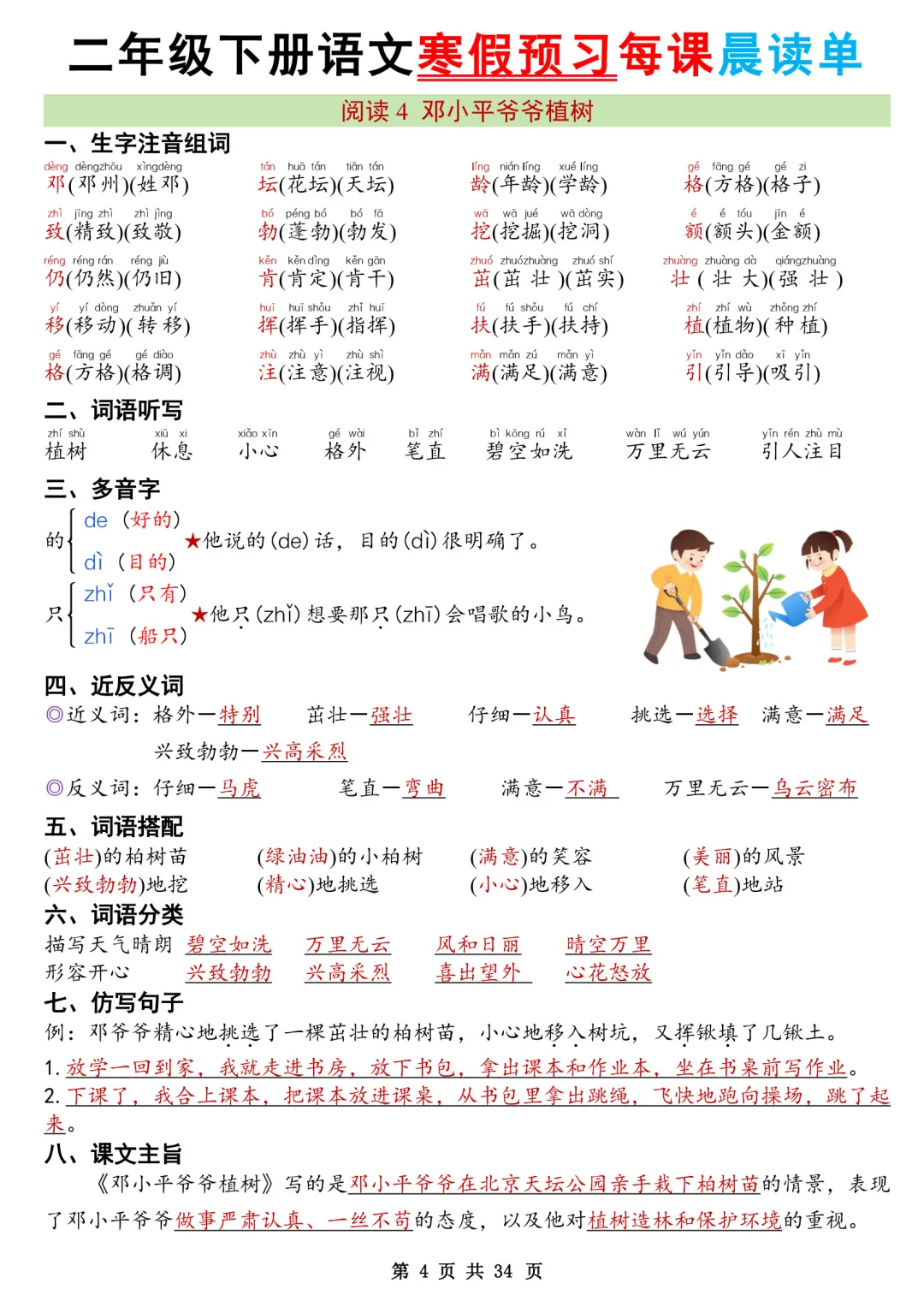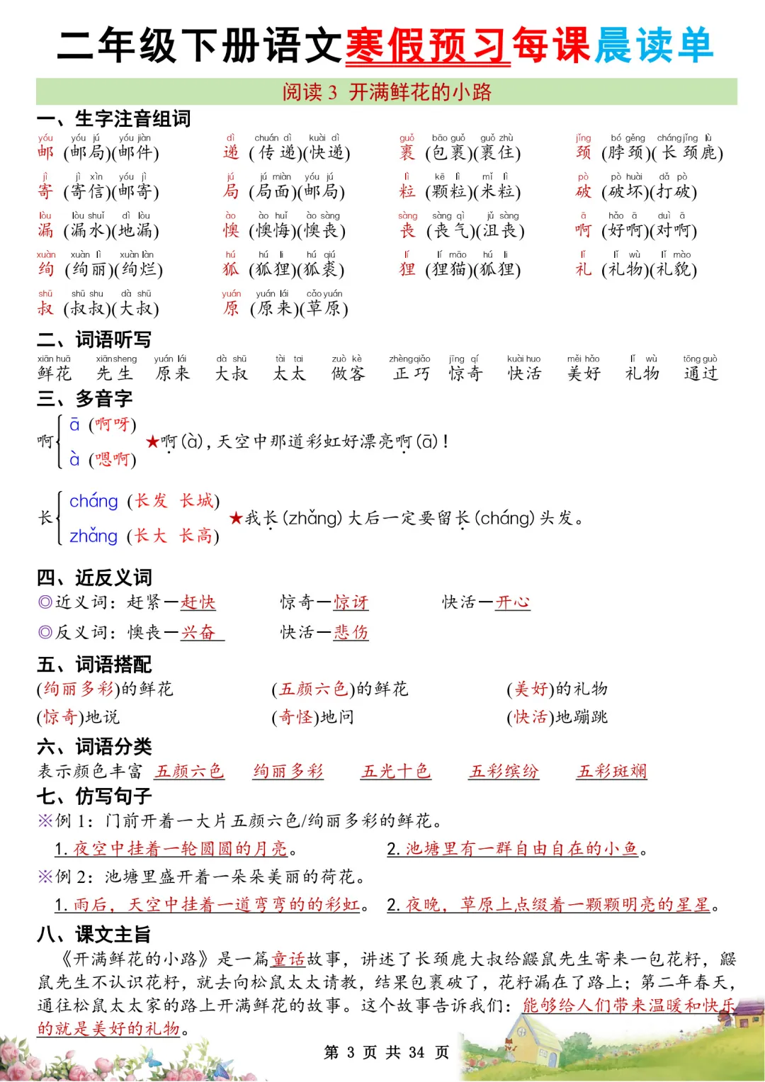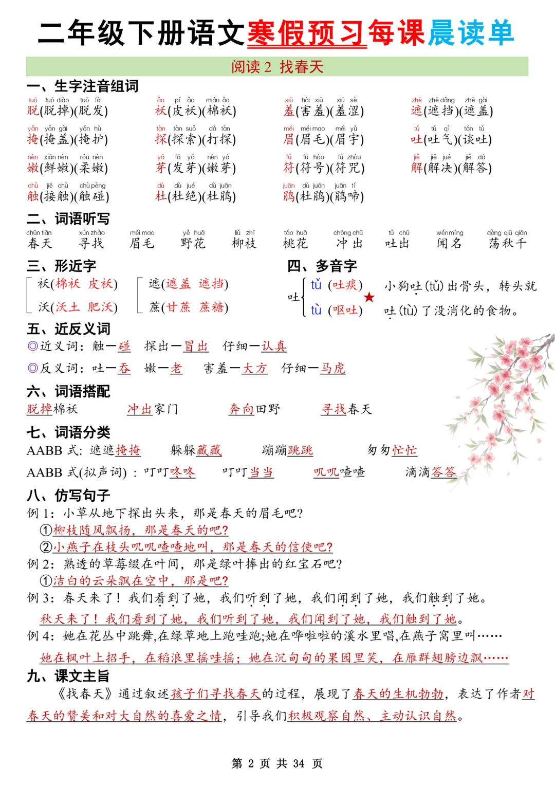 大家好,我是石头老师,每天持续分享更多优质学习资源。今天和大家分享的是2026年春新版小学二年级下册语文课本同步寒假预习每课晨读单电子版可打印内容含生字注音组词、多音字、课文主旨、古诗译文,涵盖二年级语文下册全册重点知识汇总,有助于预习下册知识,做好开学知识的衔接。