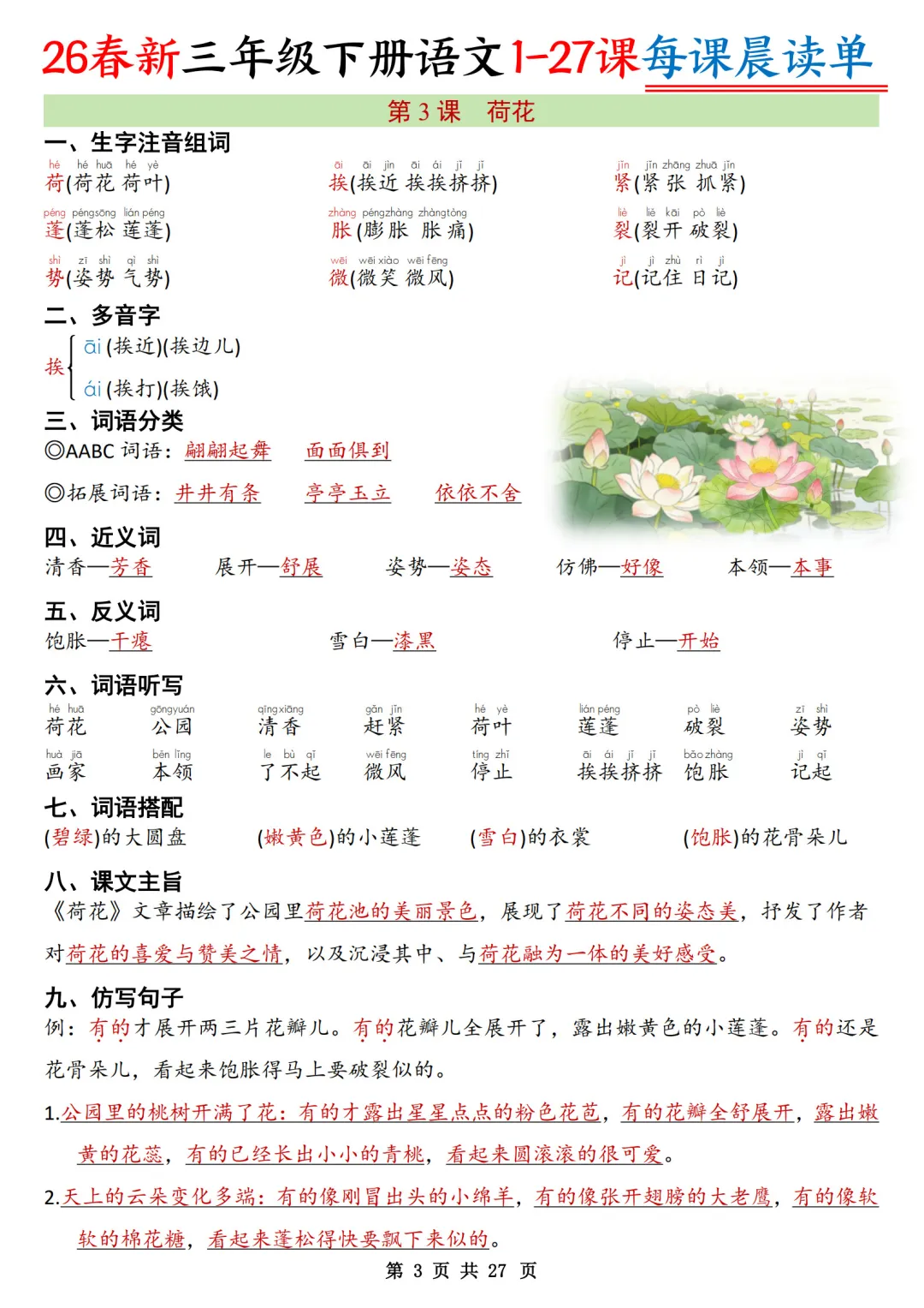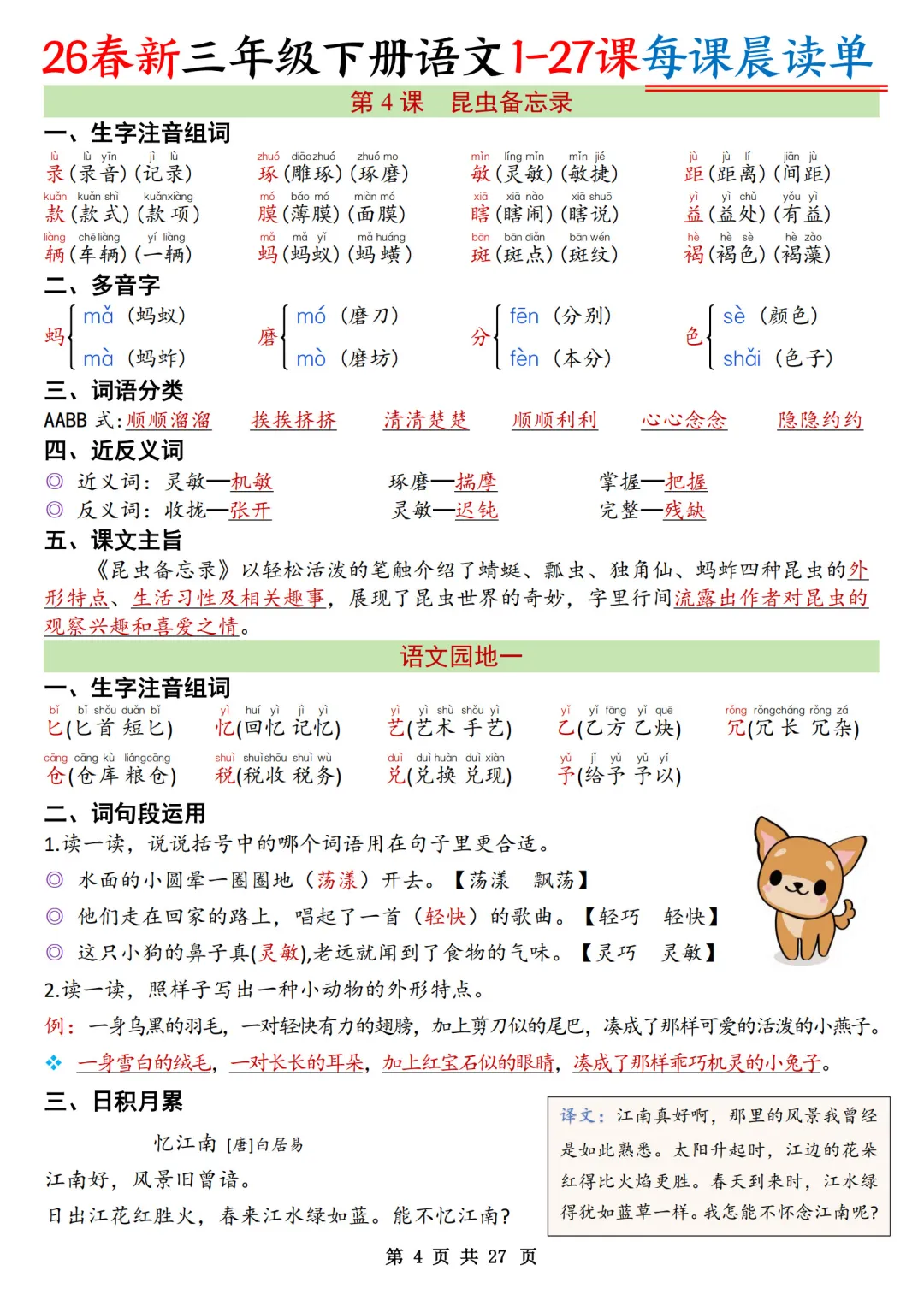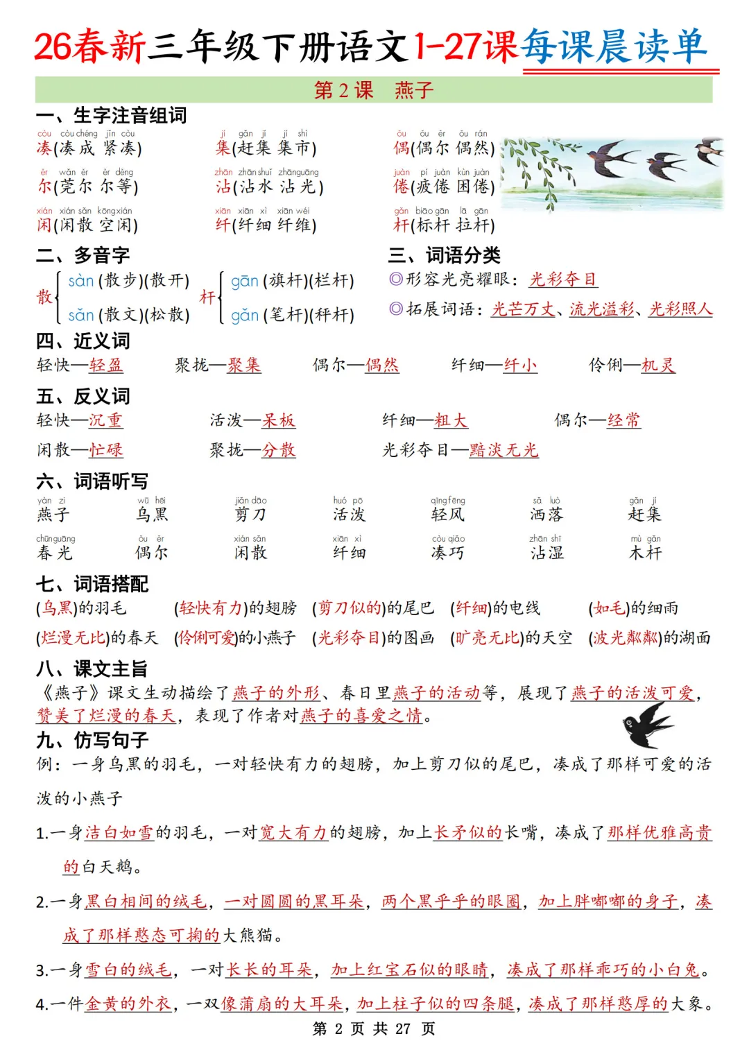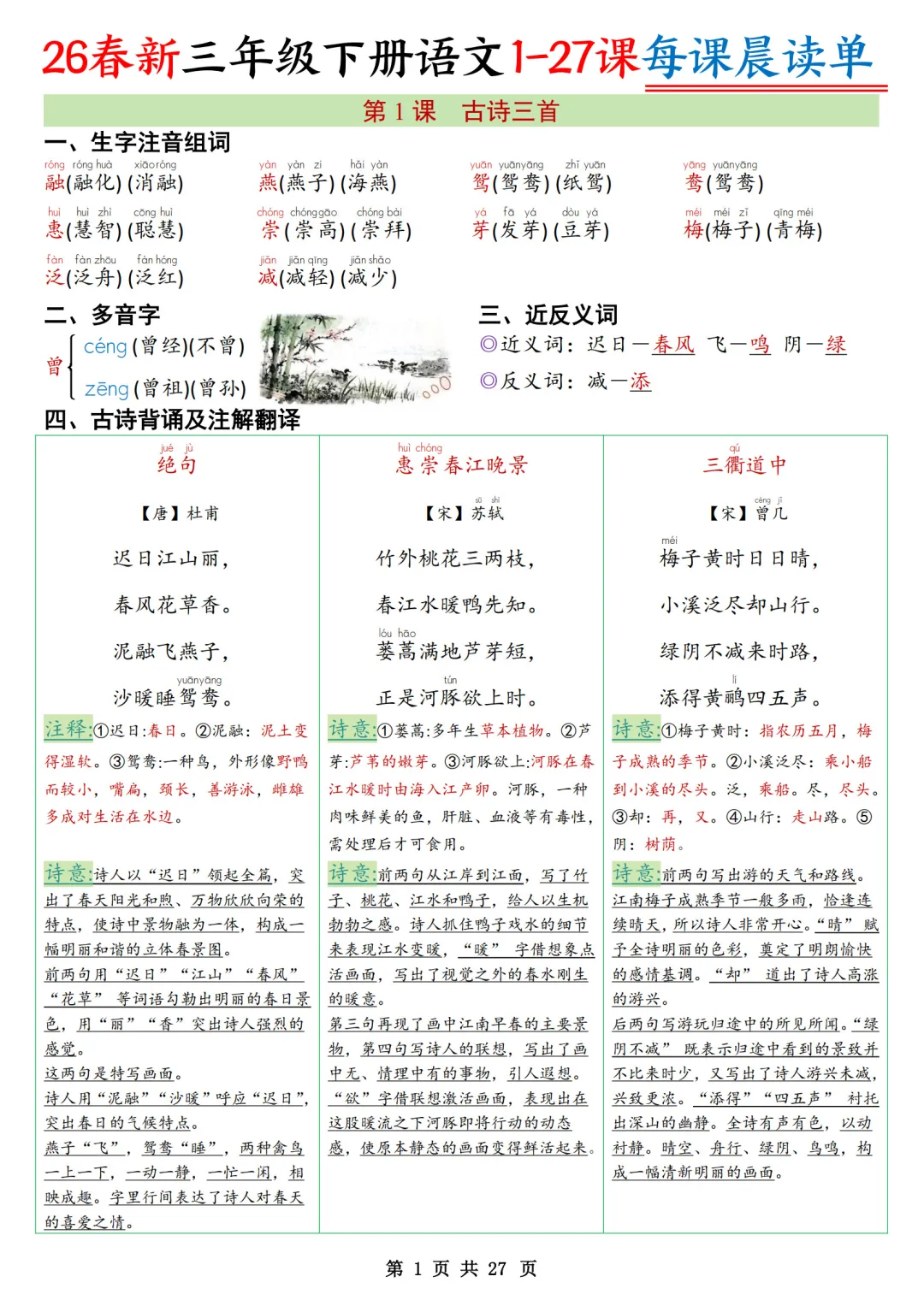 大家好,我是石头老师,每天持续分享更多优质学习资源。今天和大家分享的是2026年春新版小学三年级下册语文课本同步寒假预习每课晨读单电子版可打印内容含生字注音组词、多音字、古诗背诵,涵盖小学三年级语文下册全册重点知识汇总,有助于预习下册知识,做好开学知识的衔接。