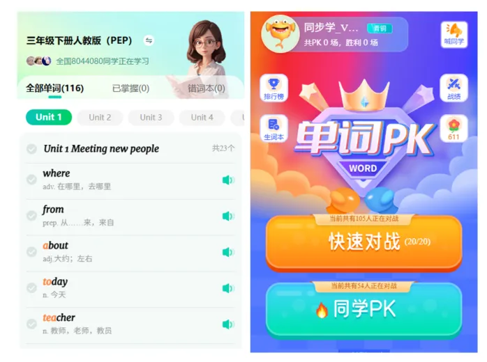多维立体输入:摒弃单纯的拼写,通过“听音、识形、懂意、造句”四个维度,配合单词PK、趣味闯关等游戏化设计,让背单词产生“心流”体验。