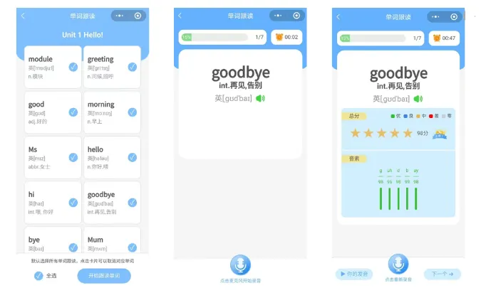 3. AI智能语音评测:撕掉“哑巴英语”的标签很多孩子不敢开口,怕读错。这里的“读单词”与“读课文”功能自带智能评测引擎。孩子读完后,系统会秒出评分,并精准指出发音瑕疵。像一位耐心纠音的外教,不断正向反馈,帮孩子找回开口说英语的自信。