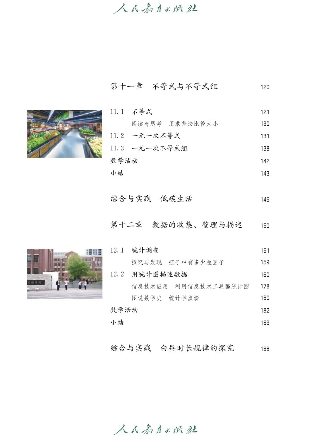 【2】第六章 实数:主要内容包含算术平方根与平方根的概念、立方根的定义、实数的分类及其在数轴上的对应。 【3】第七章 平面直角坐标系:主要内容包含坐标系的概念、用坐标表示地理位置、坐标平移的规律(左减右加,上加下减)。