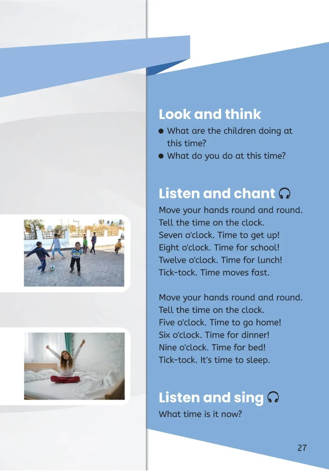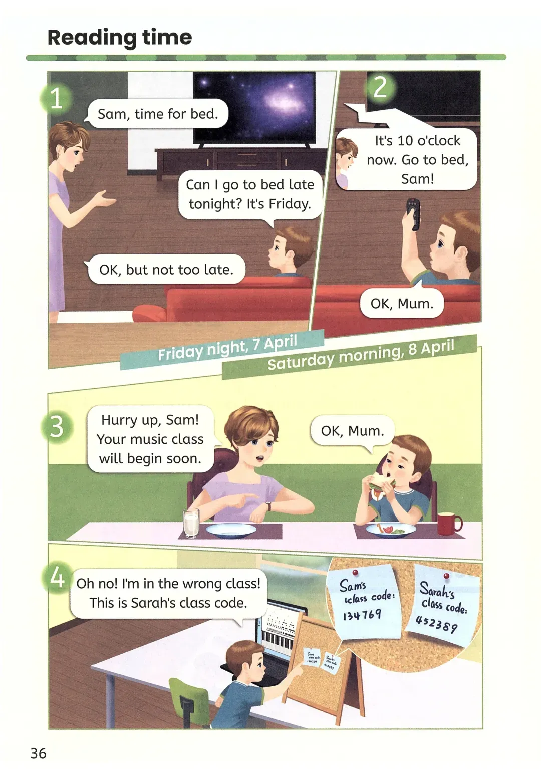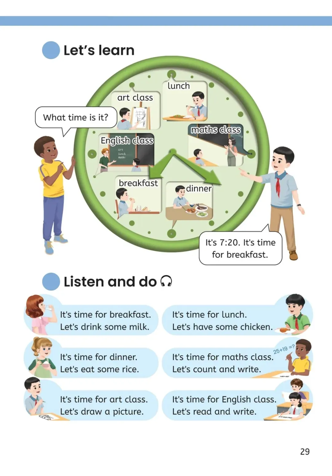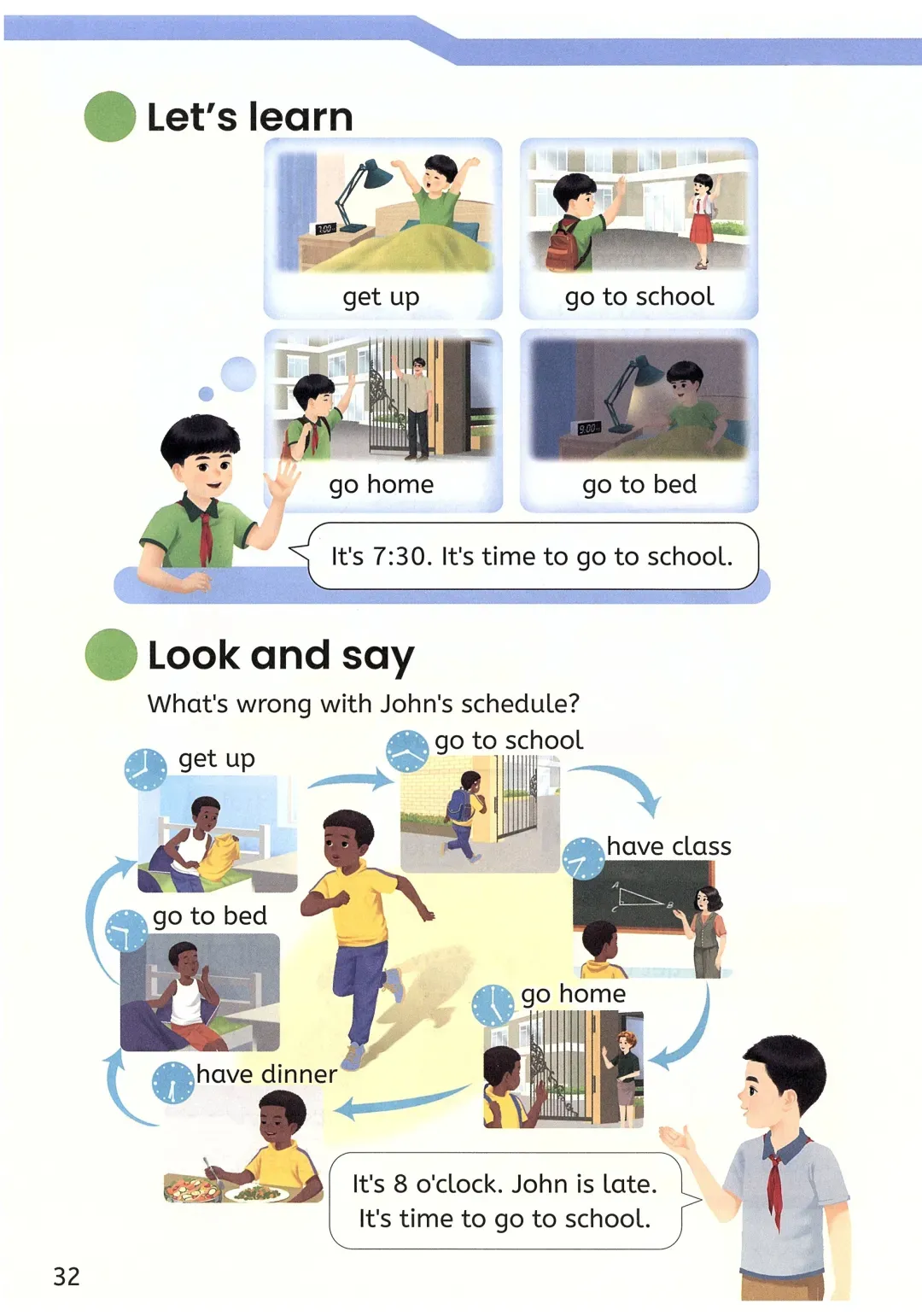 本单元围绕“如何合理利用时间”展开,核心聚焦时间表达与日常作息安排。必学板块中,学生将熟练掌握时间询问与回答的句型(“What time is it?”“It's...o'clock. It's time for/to...”),积累校园相关词汇(art class、maths class、lunch、dinner等课程与餐饮词汇)和日常作息短语(get up、go to school、go home、go to bed等)。通过对话练习,学生能描述自己的校园作息表,理解合理安排时间的重要性。语音部分针对“or”字母组合进行专项训练,结合时间主题的歌谣提升发音熟练度。Part C的项目活动是“制作周末作息表”,学生需自主规划周末时间,设计合理的作息安排,并分享遵守作息的方法(如设置闹钟、请家人监督等),培养时间管理能力。阅读板块通过Sam因作息混乱出错,最终学会合理规划时间的故事,让学生在真实情境中体会规律作息的意义,巩固时间表达与作息相关词汇。