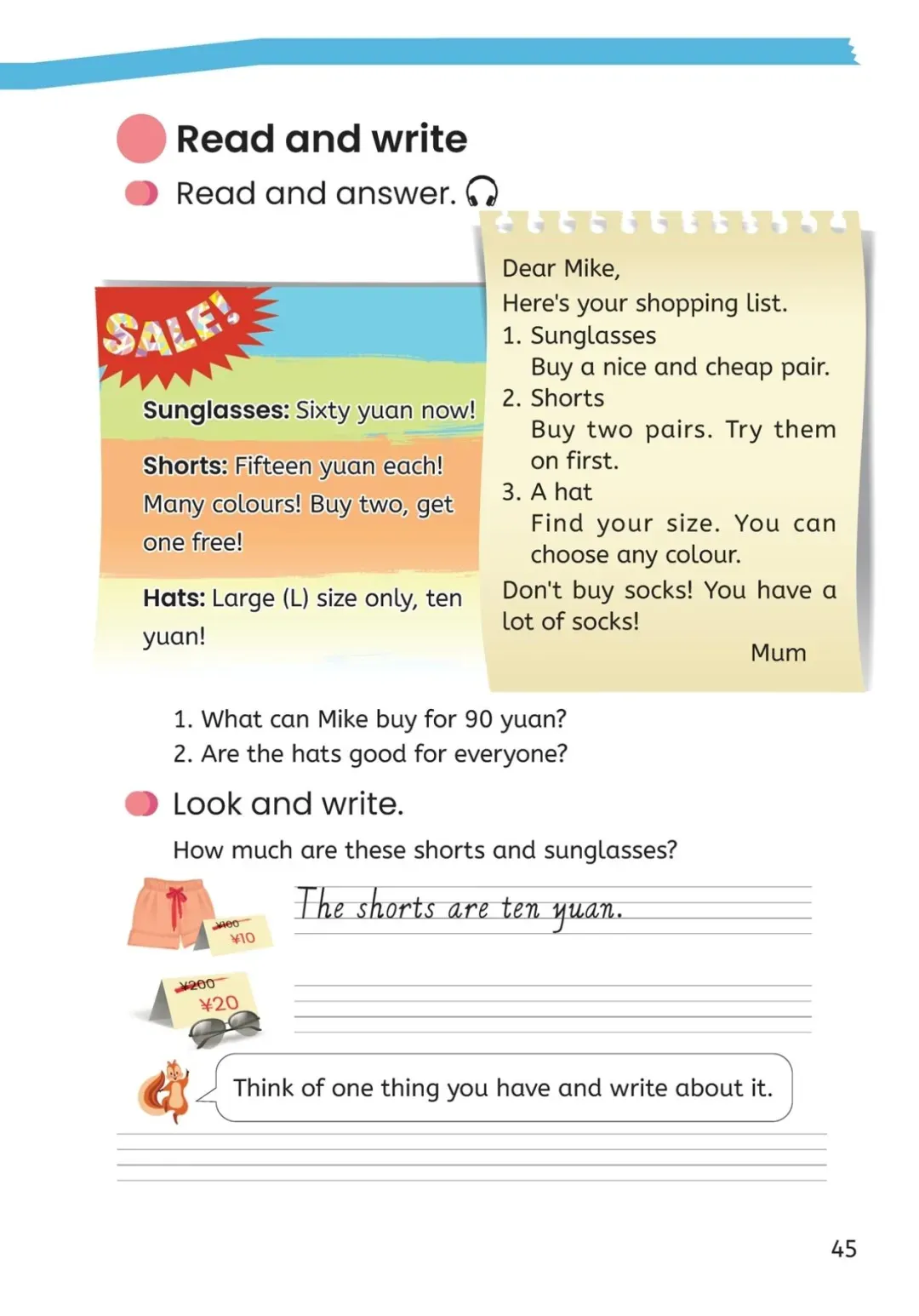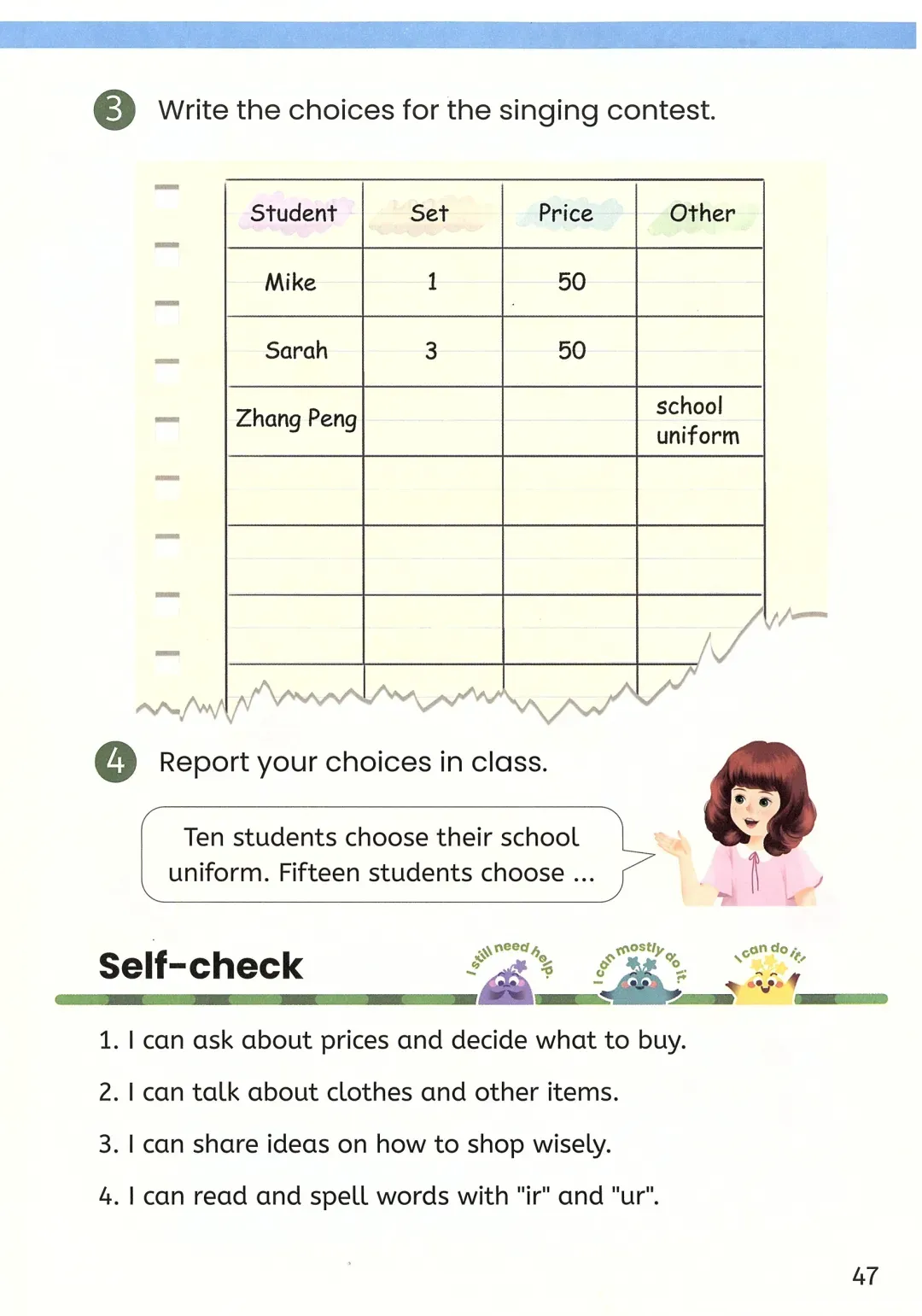单元以“人们如何做出购物选择”为导向,聚焦购物场景的英语运用。Part A和Part B中,学生将学习衣物类核心词汇(trousers、shorts、jacket、skirt、sunglasses、hat等),掌握购物相关的关键句型(如“Can I buy...?”“How much is/are...?”“It's expensive/cheap.”等),能够表达购物需求、询问价格、做出购买决策,同时理解“合理消费、按需购买”的理念。语音训练重点突破“ir”和“ur”字母组合的发音,通过购物主题的歌谣帮助学生巩固。Part C设置“为歌唱比赛选择服装”的项目活动,学生需结合预算、场景需求挑选服装,计算价格并汇报选择结果,提升实际运用语言的能力。阅读板块讲述了Ben为购买心仪的红色自行车存钱,最终收到父母惊喜礼物的故事,既强化了购物相关词汇与表达,又传递了“努力与感恩”的价值观。