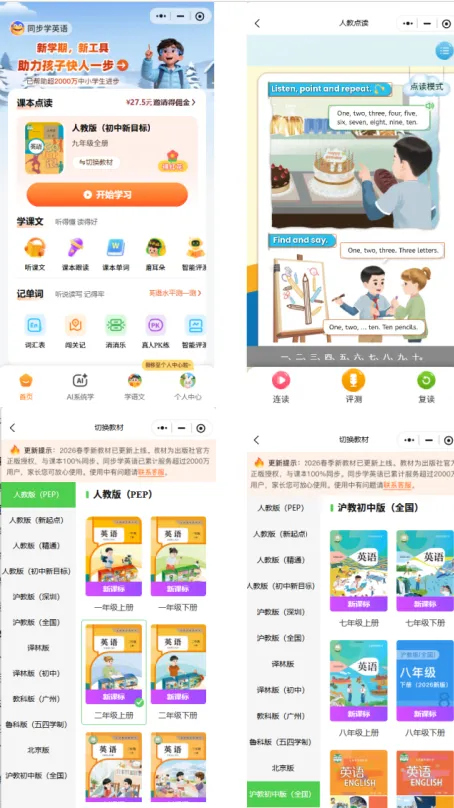 现在打开「同步学英语」小程序,同步2026春新教材,让孩子轻松预习,新学期从容应对挑战,赢在起跑线~