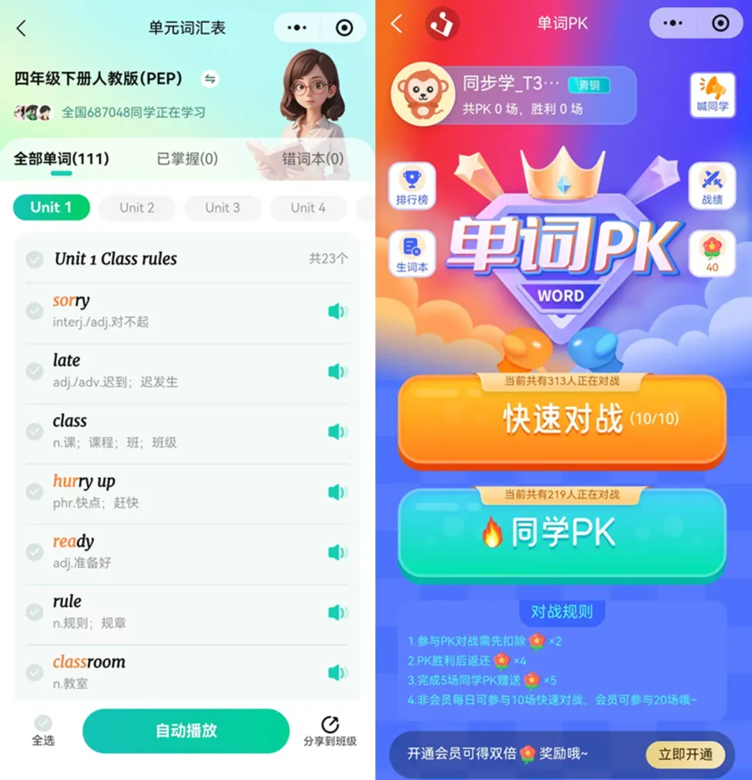 针对新教材词汇量暴增痛点,结合艾宾浩斯遗忘曲线,AI 智能规划个性化复习节奏,从 “音、形、义、用” 四层输入,搭配听、读、拼写全方位输出,拒绝死记硬背,让单词记得牢、用得活。闯关记单词、单词 PK、真人对战、单词消消乐等趣味模式,把单词学习变成小游戏,孩子越学越上瘾;延伸例句 + 图文辅助,不仅记意思,还会灵活运用,考试阅读不卡壳、写作有素材。