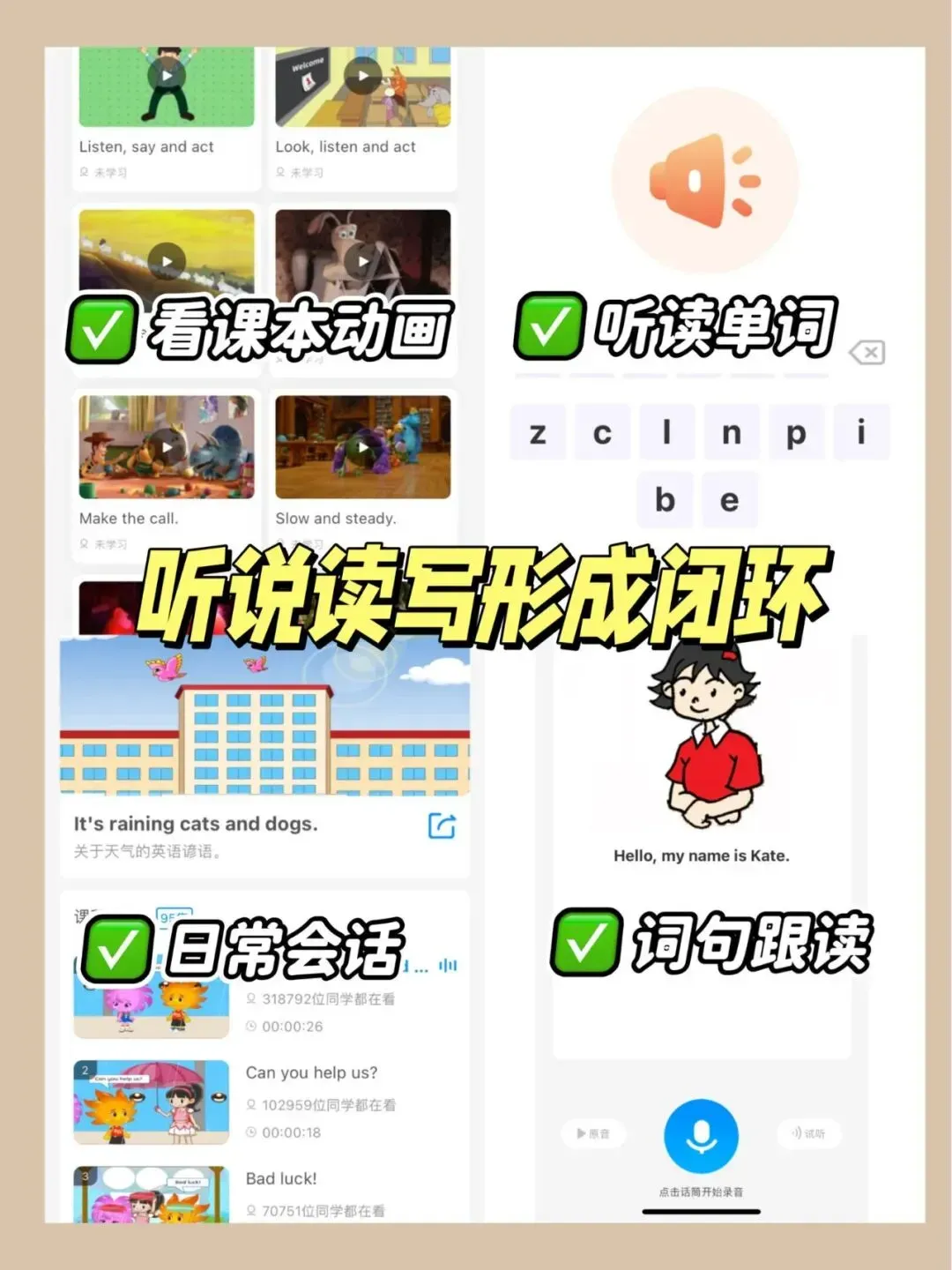 紧扣新教材 “以读促写、情境应用” 要求,从输入到输出全链条培养孩子英语能力,层层递进不脱节:📖听课文:教材原音磨耳朵,支持定时关闭、顺 / 乱序播放,每天 10 分钟,提升听力敏感度🗣读课文:逐句领读 + 情感朗读,搭配课本动画,理解深层含义,培养地道语感🎭演课文:动画配音、情景对话演练,把课本知识转化为实际应用能力,契合场景化学习要求✍️练读写:同步配套词句练习、核心句型积累,为阅读拓展和写作表达打下坚实基础