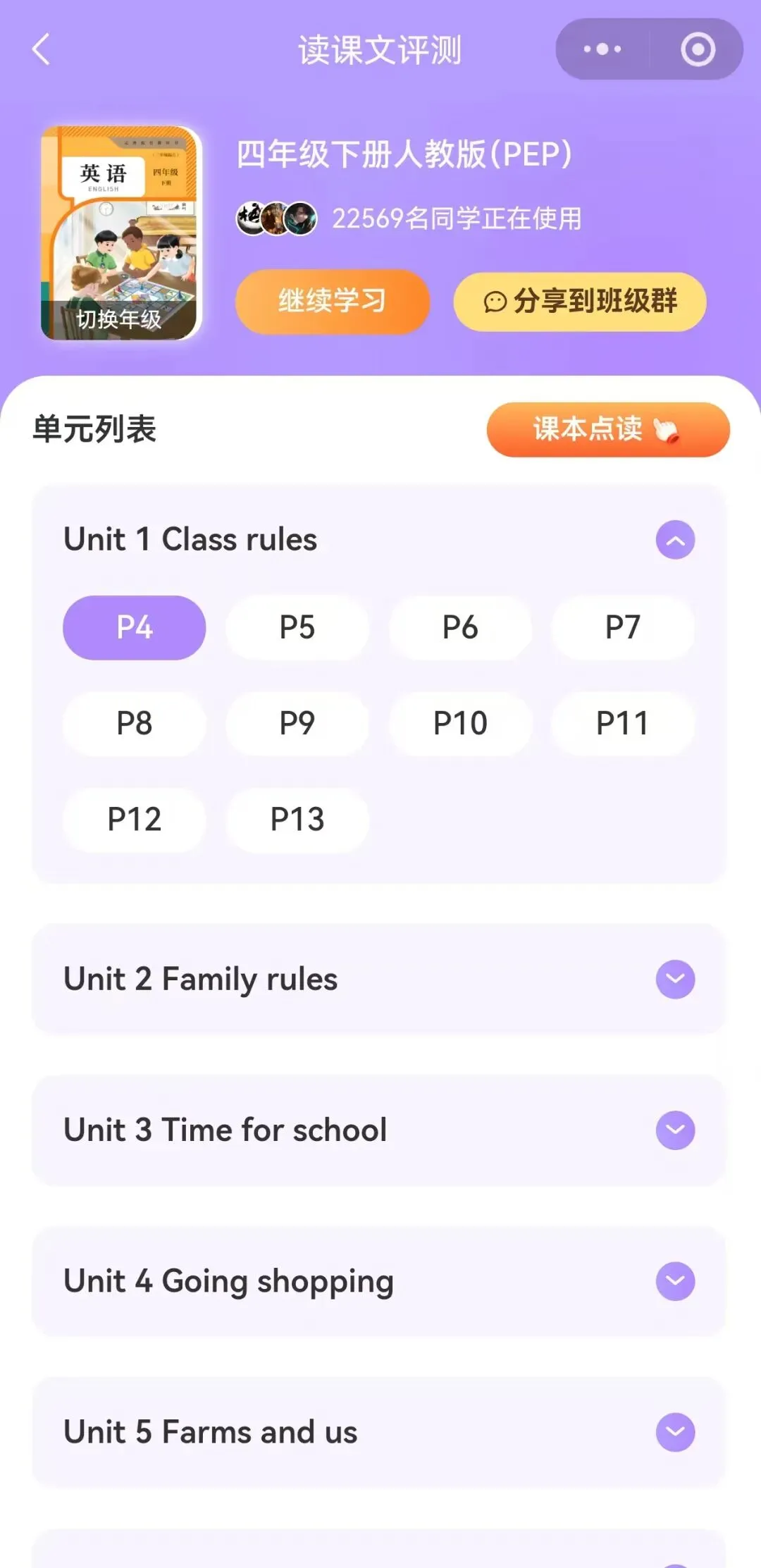 小程序同步打造高清电子课本,与纸质课本页码、内容完全一致,支持精准定位单元、课时,实现 “哪里不会点哪里”。目录快速切换、重点词句标注,让孩子阅读课文时能精准攻克难点;连读、点读自由切换,配合中英文对照,帮助孩子理解课文含义,提升阅读能力,应对新教材增加的阅读量和长难句挑战。