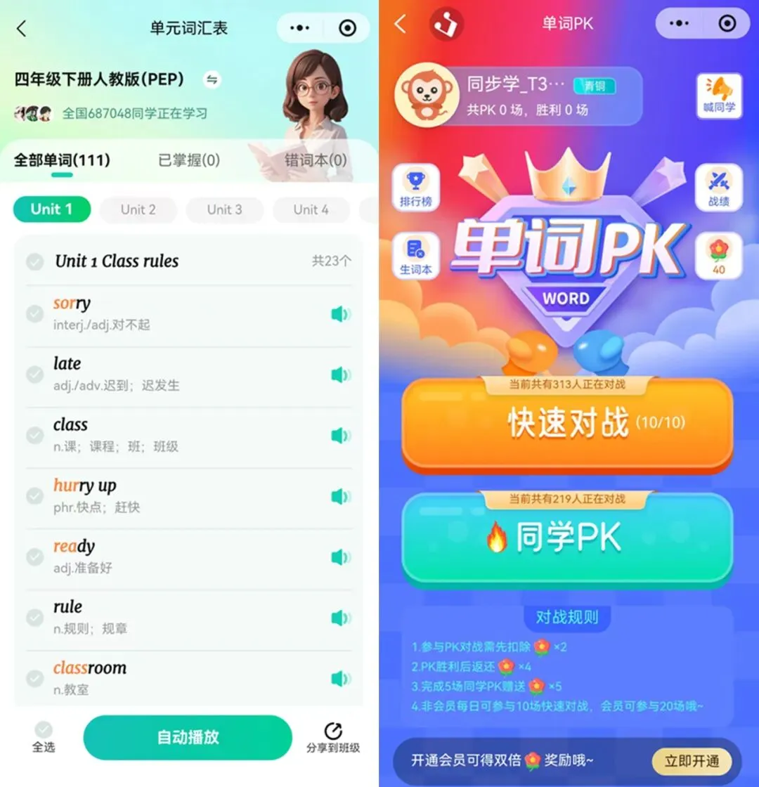 单词专项练:单词闯关、单词消消乐、真人单词 PK、每日记单词、单词听写五大功能,告别机械背诵,用趣味互动让孩子牢记单词,轻松应对新教材的词汇量要求;