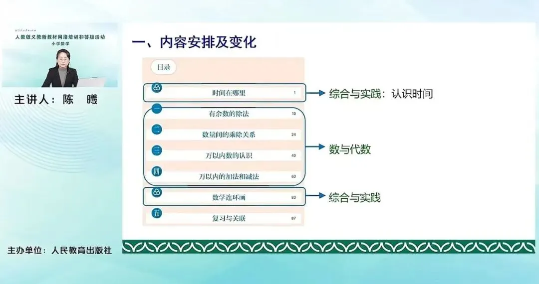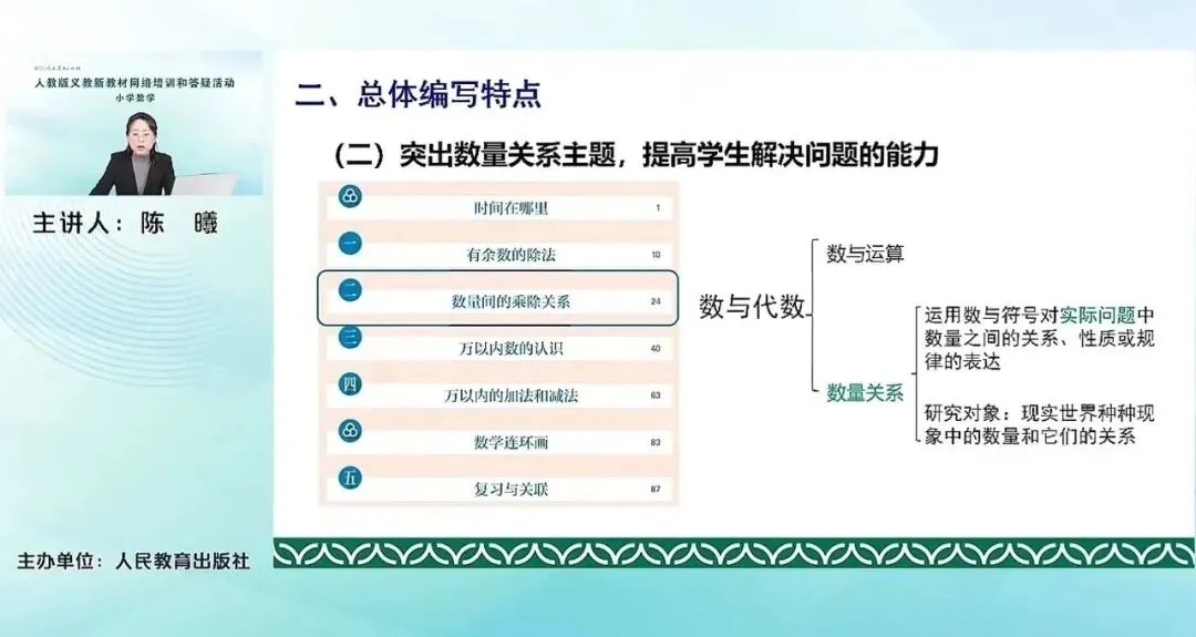 比如说我们这册教材属于代数领域下属的主题就整合的比较明显,充分的体现了学习内容的整体性和一致性。比如有余数的除法,对二上表内乘除法学习的这个进一步延伸的基础上,从本质上让学生看到能整除到不能整除的这个过程,它其实是对数的计算的进一步的扩展。在学习表内乘除法以及有余数除法的过程中,学生运用了运算的这个意义,解决了一些简单的实际问题。在这个基础上,教材及时安排数量间的乘除关系。通过理解倍的概念,在数量关系主题下构建乘除关系的模型。这样安排,从学科内容逻辑的角度来讲是顺的,也便于学生在整理和迁移中去学习新的知识。关联内容结构化还体现在数的认识和数的运算有机结合,将这两个相关联的内容一前一后的安排在这一册,以计数单位为核心,学习数的组成、数的读写法,以及加法、减法等等。让学生去体会不同计数单位之间的转化,感受十进制、位值制的思想。这和我们一年级下册百以内数的认识和百以内的口算、笔算先后编排,有机结合是类似的,帮助学生感受数的认识和数的运算之间的密切关系。这也体现了我们教材编排的整体性。