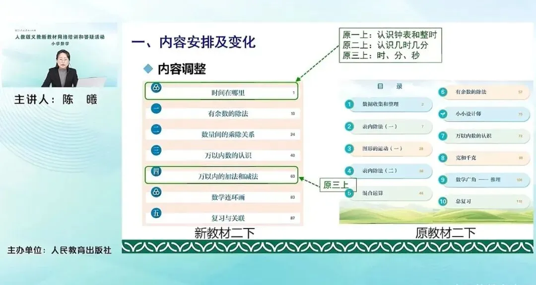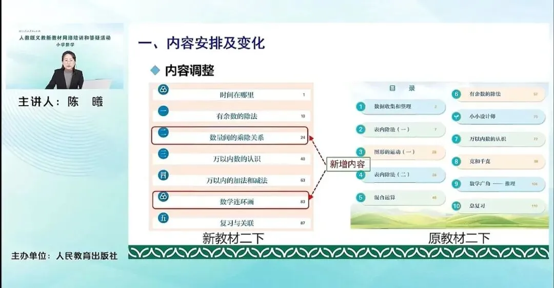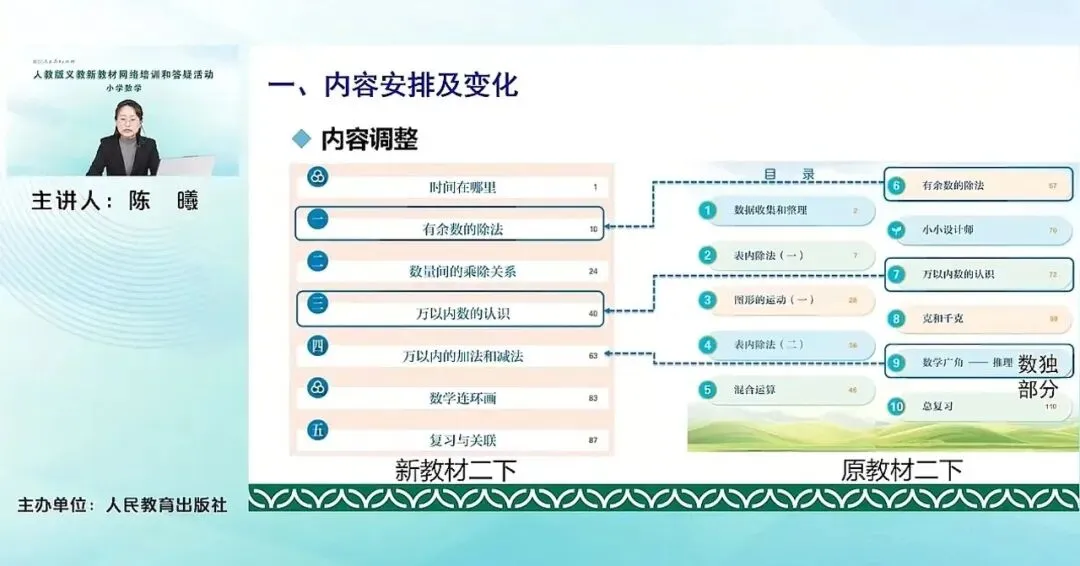 对比来看,我们原来修订前二年级下册的表内除法一、表内除法二,都已经移到了新教材的二年级上册,相信老师们都已经看到。而原来的混合运算、克和千克,移至新教材的三年级的上册。原来的数据收集整理,以及图形的运动(一)移至了新教材的三年级下册。