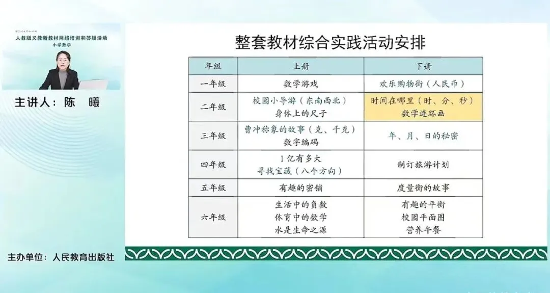 我们这册主要的综合实践领域的内容包含的就是课标里这里给出的学习时间的相关的主题活动。主要是在时间的认识、运用以及拓展研究中发展的对时间长短的变量。那本册的第二种综合实践活动是数学连环画,这也是课程标准中建议要求的一个活动,是运用理解数学知识啊进行的跨学科的主题活动。发展学生的应用意识和创新意识。