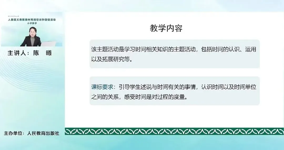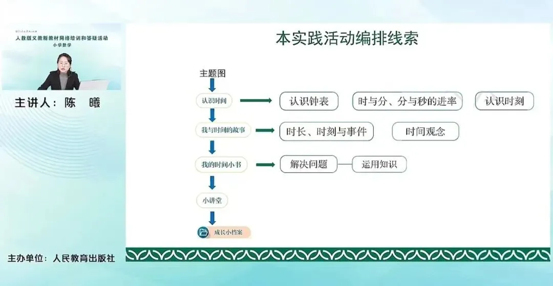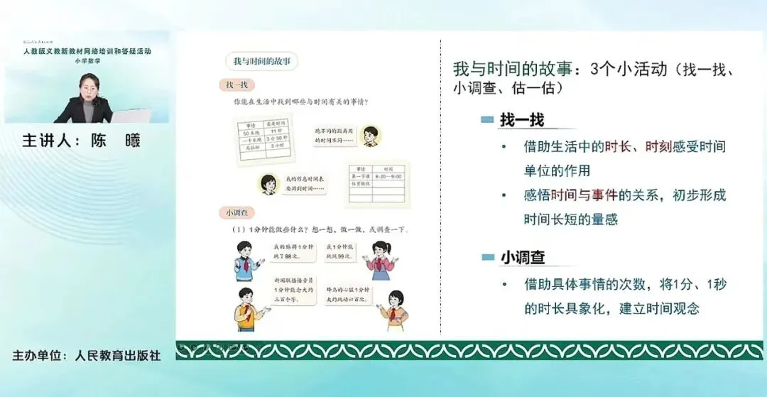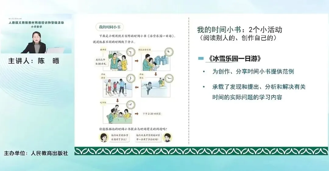 在每一个活动编排之下,又分别安排了几个小活动。比如认识时间,里面就包含了认识钟表,认识时与分分与秒之间的这种单位的进率,认识时刻。那我与时间的故事中,就包含了时长、时刻与时间之间的关系,建立时间的观念。我的时间小书,它里面就包含了除了去制作、分享我的时间小书,还有去解决一些和时间有关的简单问题。比如说求时长啊、求开始时间、经过时间等等。