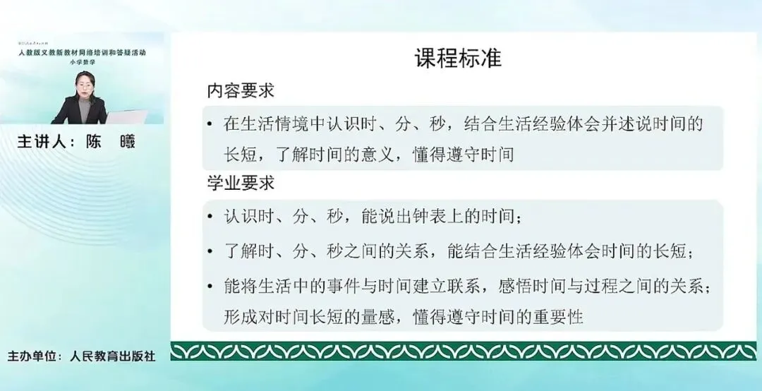 主要是要让学生在生活情境中去认识时分秒,在活动中去感受时间的长短,懂得遵守时间。从学业要求的角度来说,要让学生能够认读钟表上的时间,了解时分秒单位之间的关系,结合自己的生活经验去体会时间的长短,并且能够把生活中的一些简单的事情和时间建立一些联系,感受时间和过程之间的关系,形成对于时间的量感。