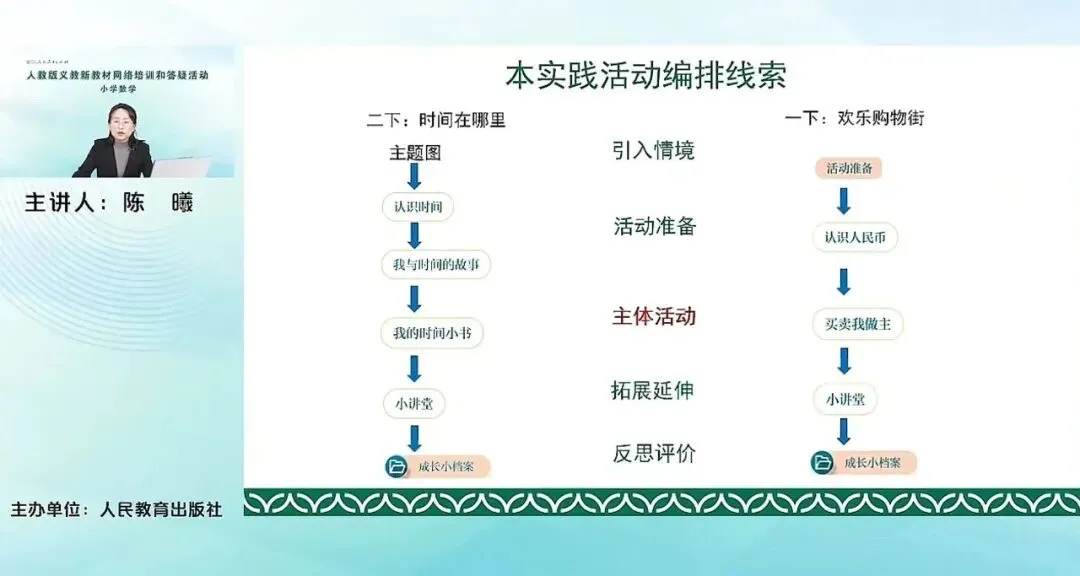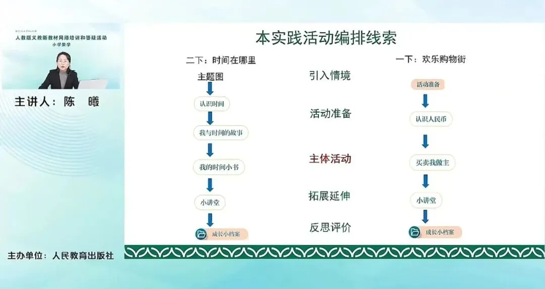 这个编排线索与我们之前老师们已经看到的综合实践活动的这个编排线索是差不多的。比如说我们已经看到的一年级下册的欢乐购物街,其实也是基本上按照这样一个编排线索来进行的。比如说它也是通过引入情境,活动的准备,认识人民币,去进行一个引入和准备的环节。然后主体活动,就是买卖我做主这样一个活动。最后是小讲堂以及成长小档案这么几个环节。所以老师们可以看到,其实我们整套的教材基本上都是按照这样一个思路来编排的。