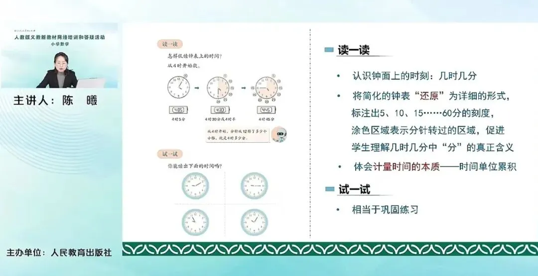 第三个小活动是读一读,主要是认识钟面上的时刻,几时几分。是把简化的钟表稍微还原一些,还原成稍微详细一点的形式去标注出5时、10、15、20等等。这些刻度方便学生去认读这个时间,理解几时几分的这个分,它表示的这个含义。这个是对学生来说相对难一点,所以通过这种简化钟表的还原,帮助学生来看到分到底是多少分,去便于认读。也在这个认读钟表的这个过程中,帮助学生去体会计量时间的本质就是时间单位的累积。在这个活动的最后,就是试一试。这其实也就是相当于巩固练习,帮助学生去再一次认读钟面上的时间。