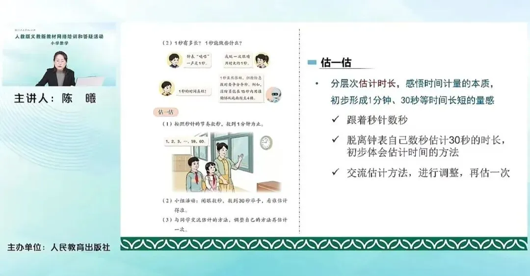 第三个小活动估一估是分层次的去估计时长,帮助学生感悟时间计量的本质,初步形成1分钟或者30秒等等这些非常常见的时间长短的量感。这里估一估其实它的层次是很明显的。首先第一个层次是跟着秒针去数秒,1、2、3这样数秒去数出1分钟,感受1分钟,以及感受这个秒的这个节奏。那到了第二个层次,就是让学生闭着眼睛,脱离钟表,自己去估计30秒的这个时长,初步的体会估计时间的方法。这里他就要在前面数秒节奏的基础上去进行一个估计。第三个层次,让帮助学生去互相交流自己的这个估计的方法,然后进行调整,看自己估的。如果估的不太准的情况下,再进行一个调整,再估一次。通过这么有层次的三个活动,逐步去形成对1分或者30秒,这种时间长短的量感。