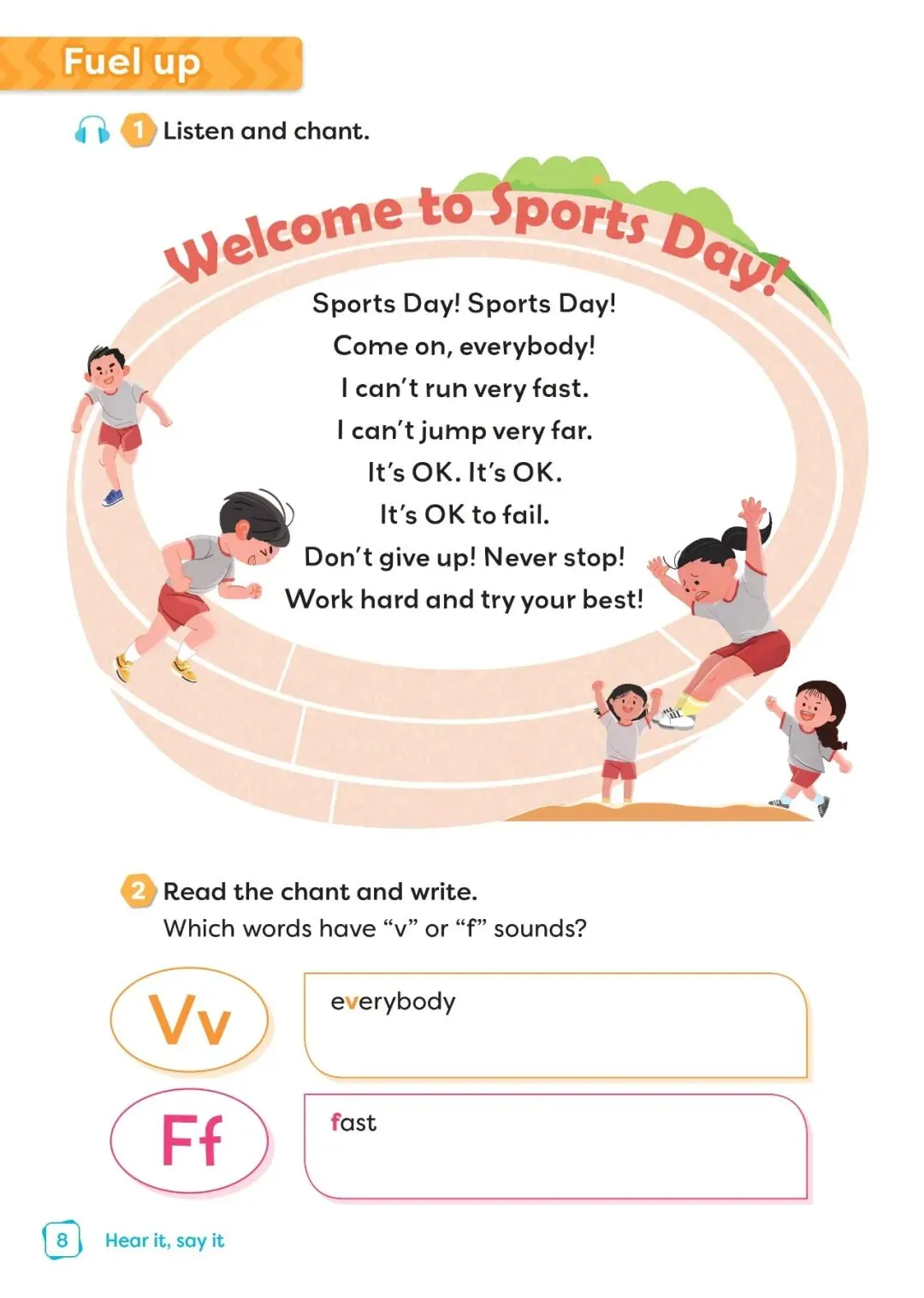 核心词汇与短语:掌握 sport, football, basketball, swimming, running, interesting, difficult 等重点词汇;熟练运用 play sports, jump high, jump far, give up, try one's best(基础 / 高频)