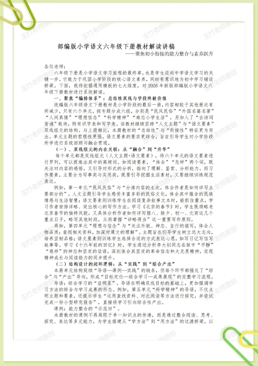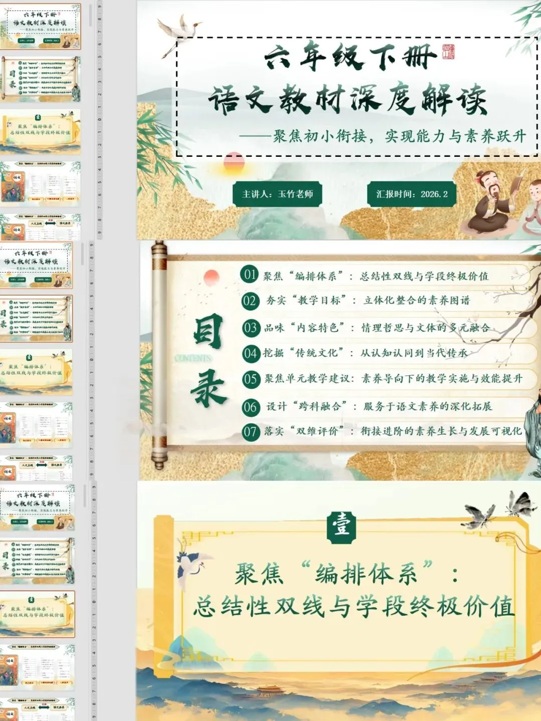 六年级下册是小学语文学习旅程的最终章,也是学生迈向中学语文学习的关键一步。它致力于巩固小学阶段的核心语文素养,同时有意识地为初中学习铺设桥梁。下面,我将依据通用模板的七大维度,对2026年新版部编版小学语文六年级下册教材进行系统解读。