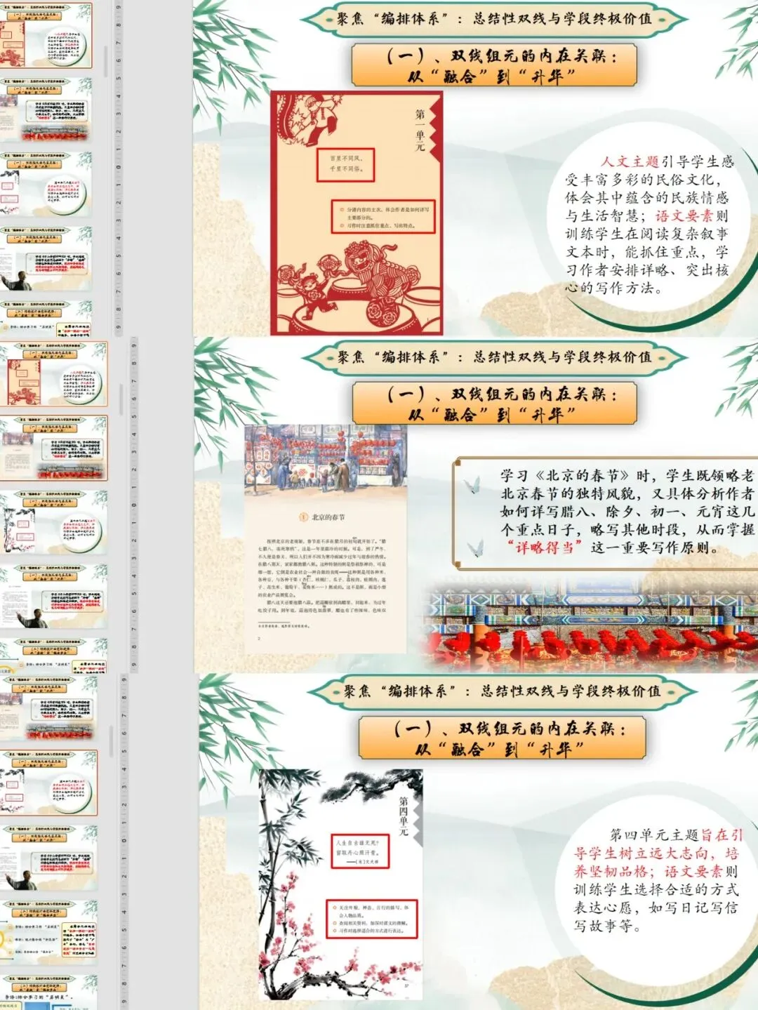 例如,第一单元“民风民俗”与“分清内容的主次,体会作者是如何详写主要部分的”。人文主题引导学生感受丰富多彩的民俗文化,体会其中蕴含的民族情感与生活智慧;语文要素则训练学生在阅读复杂叙事文本时,能抓住重点,学习作者安排详略、突出核心的写作方法。学习《北京的春节》时,学生既领略老北京春节的独特风貌,又具体分析作者如何详写腊八、除夕、初一、元宵这几个重点日子,略写其他时段,从而掌握“详略得当”这一重要写作原则。