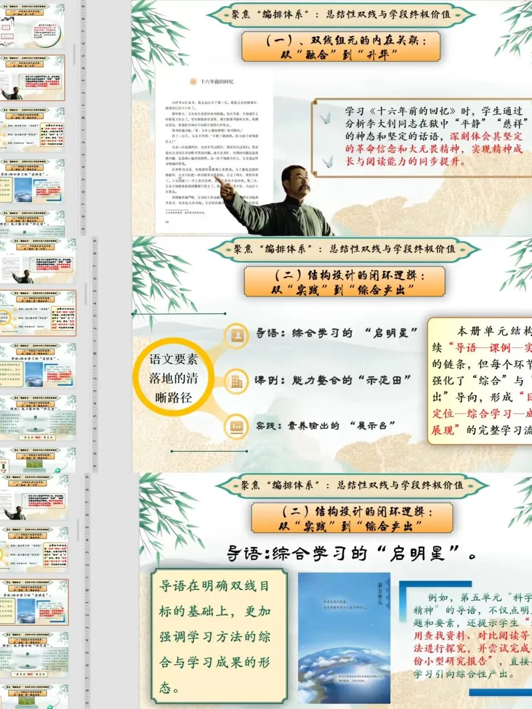 本册单元结构延续“导语—课例—实践”的链条,但每个环节都强化了“综合”与“产出”导向,形成“目标定位—综合学习—成果展现”的完整学习流程。