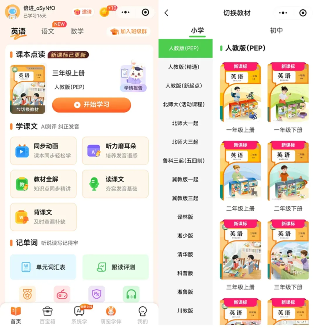 想让孩子英语学得好,基础发音不能错。倍进英语点读工具完美对接中小学主流英语教材,人教版 PEP、精通版、新起点,沪教版、译林版、教科版、鲁科版、北京版等全覆盖,小学到初中各年级内容一应俱全,与课本 100% 同步,无需担心学错、学偏。