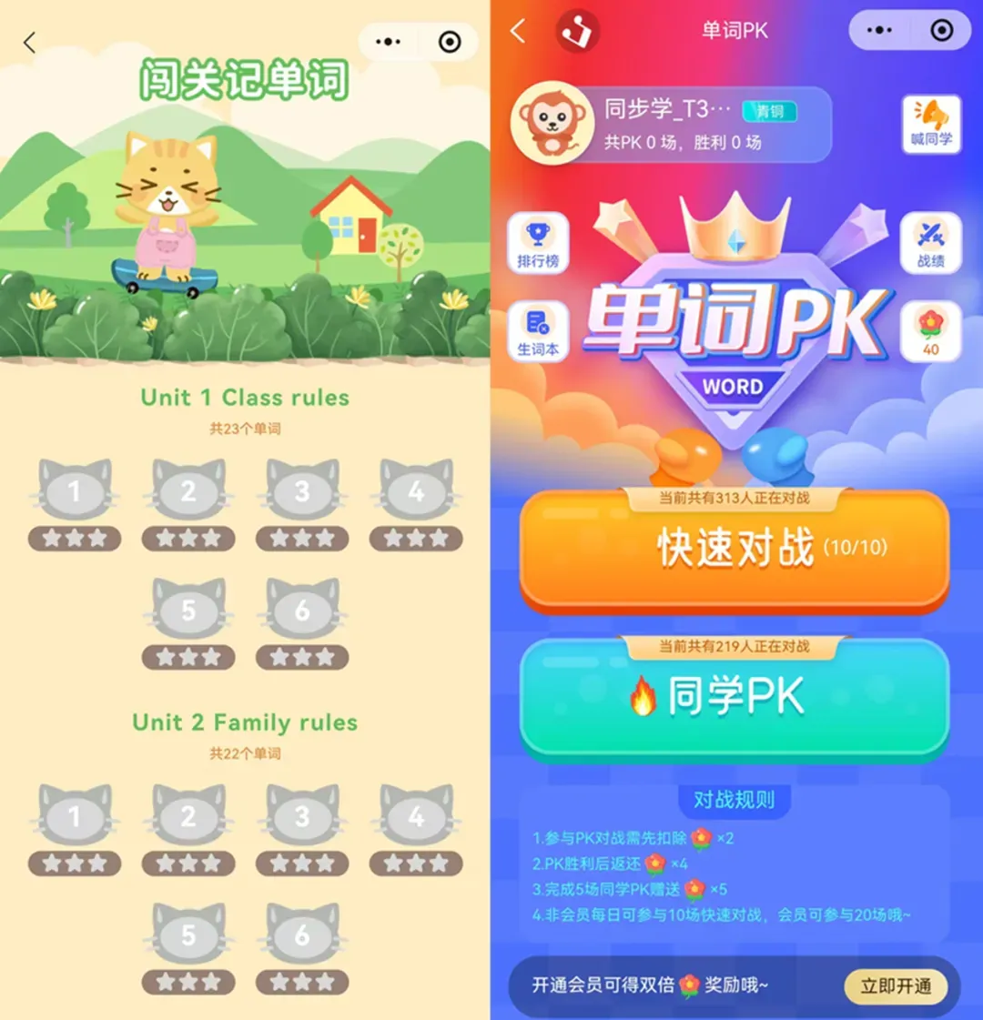 闯关记单词层层递进,把教材同步单词融入趣味任务,孩子一步步突破关卡,在挑战中高效记单词,每一次闯关成功都是一次正向激励;单词消消乐经典玩法加持,边玩边巩固单词拼写和释义,让记忆更牢固;亲子 / 同学单词 PK更是把竞技感拉满,和同学比拼、和家长互动,在欢声笑语中比拼单词量、较量发音,学习动力直接拉满。