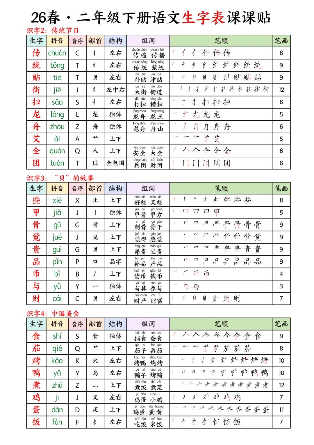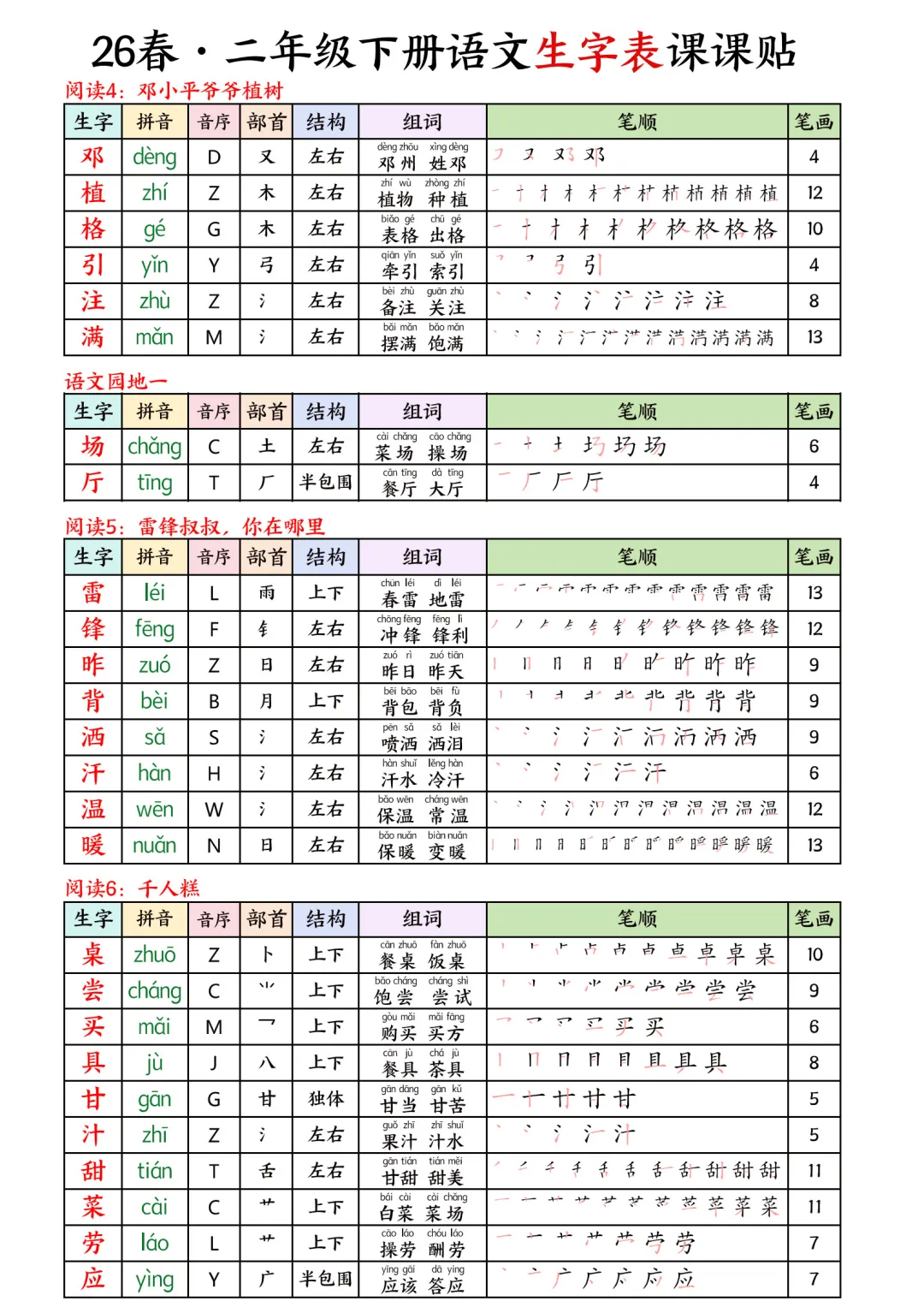 大家好,我是石头老师,每天持续分享更多优质学习资源。今天和大家分享的是2026春小学二年级下册语文课本同步生字表彩色课课贴写字表电子版可打印,内容包含课本同步生字、生字拼音、部首、结构、组词,笔画笔顺,内容丰富详细。锻练孩子基础知识,帮孩子扎实衔接新学期。每天朗读5分钟,让寒假学习不松懈,语文学习能力稳步提升,为下学期打好基础,一起学习吧。