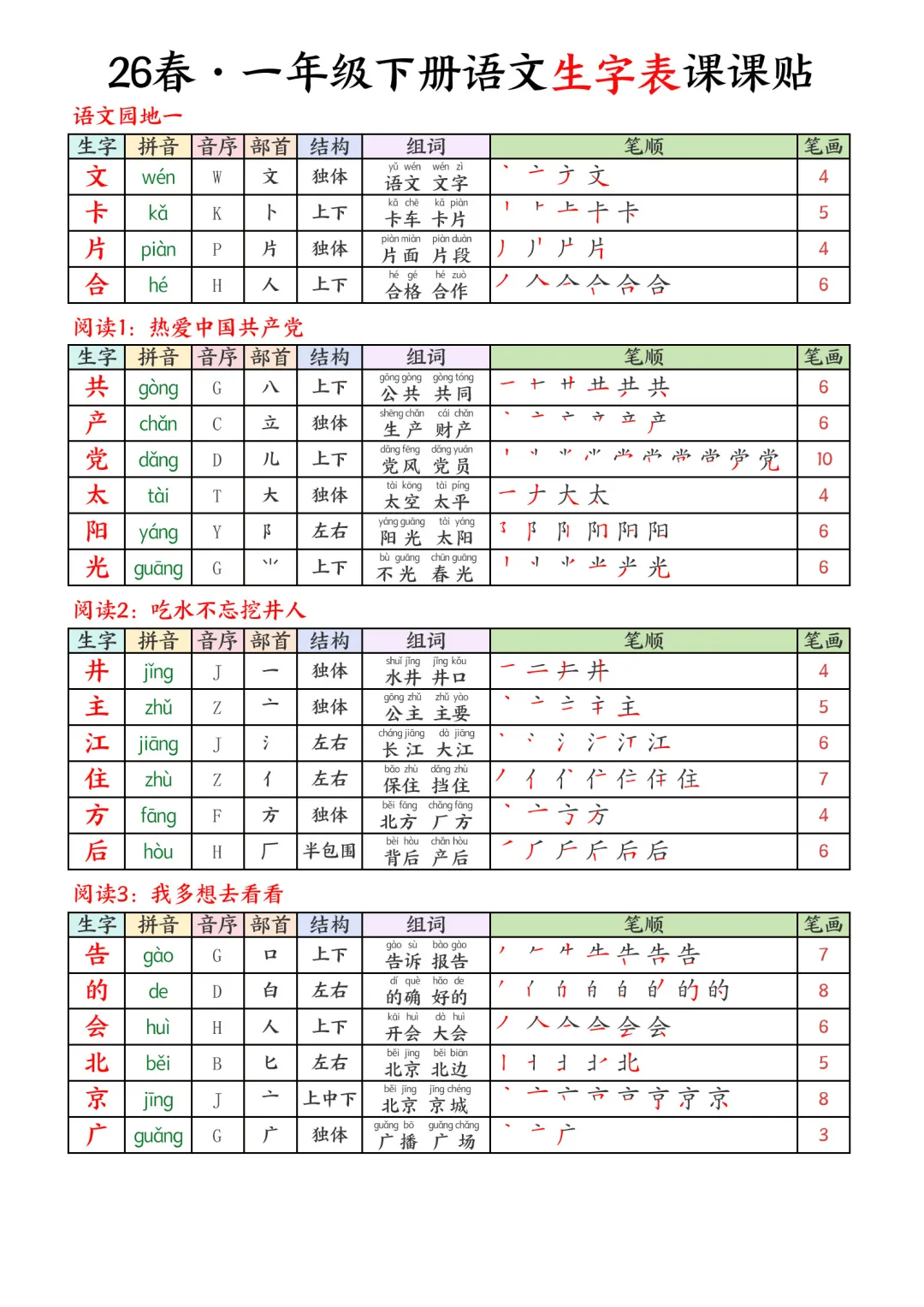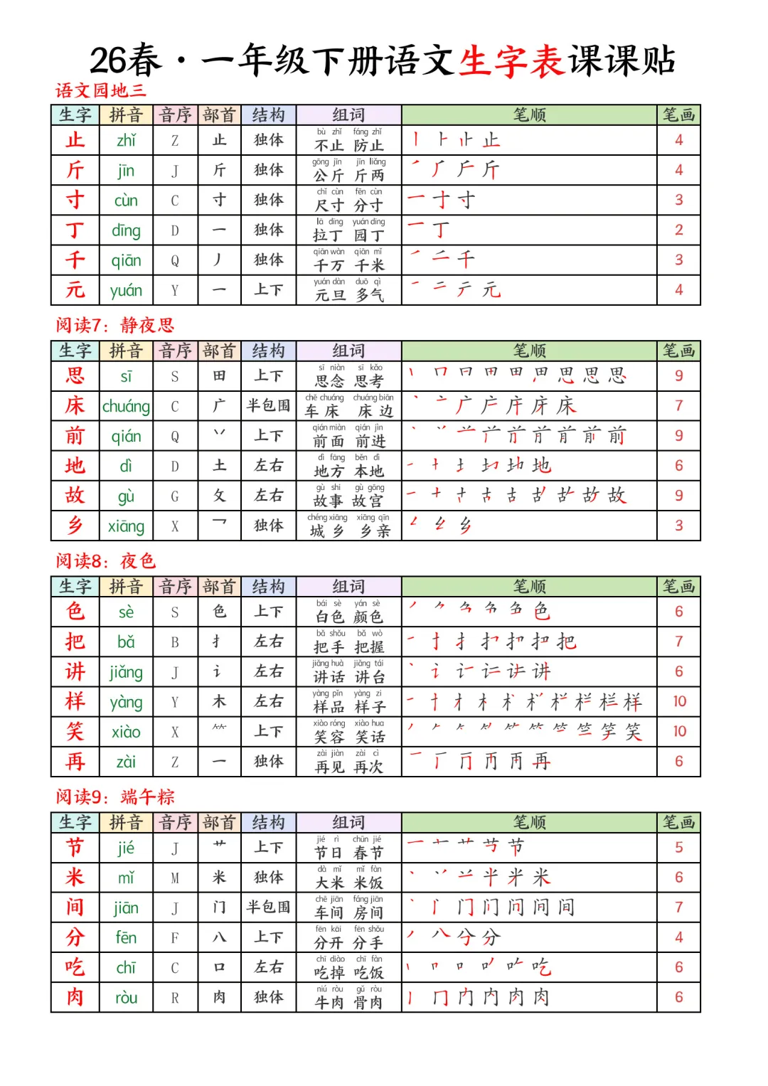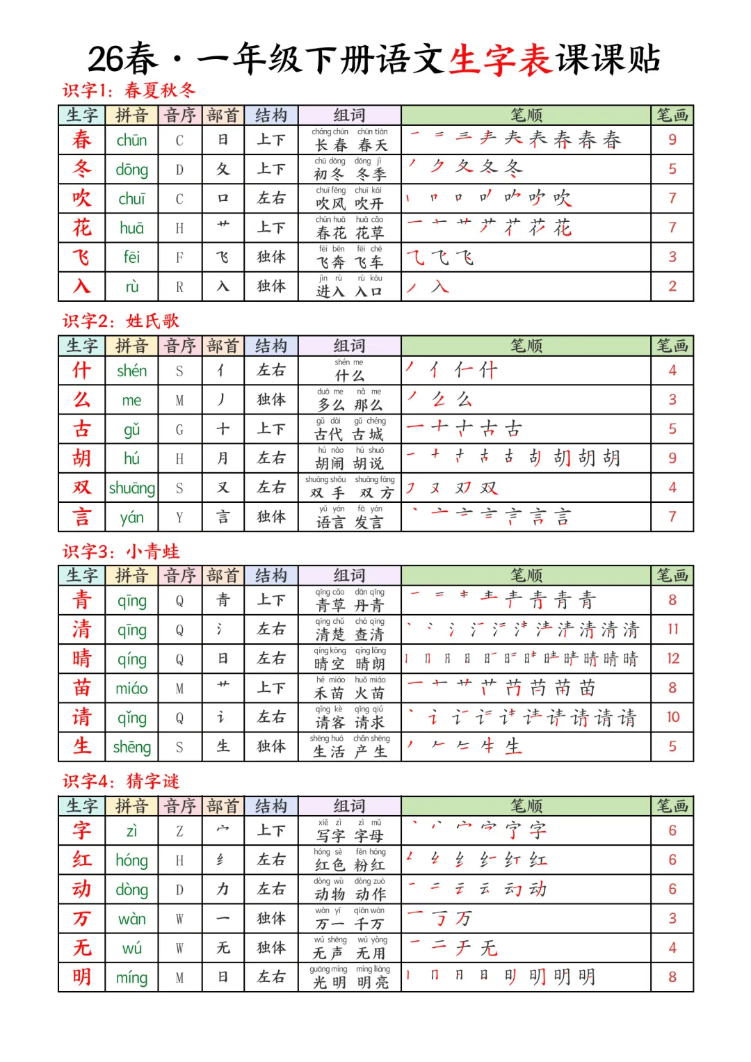 2026春小学一年级下册语文课本同步生字表彩色课课贴电子版可打印#教辅#寒假预习#课课贴#每课一贴#教育#亲子育儿#全册知识#写字表