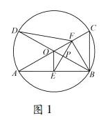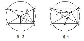 如图 2,取 OB 中点 G,联结 FG. 由OE⊥AB 于点 E,可知点 E 是 AB 的中点,于是 OE