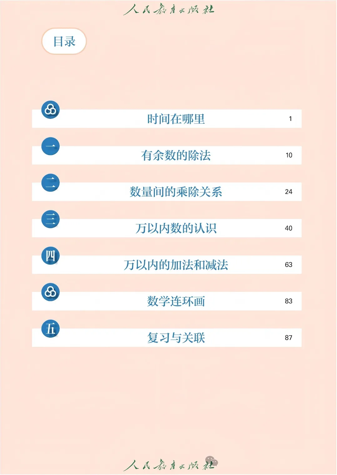 这是我们本册教材的目录,分别是时间在哪里、有余数的除法、数量间的乘除关系、万以内数的认识、万以内的加法和减法、数学连环画以及最后的复习与关联,也就是原来我们总复习的内容。