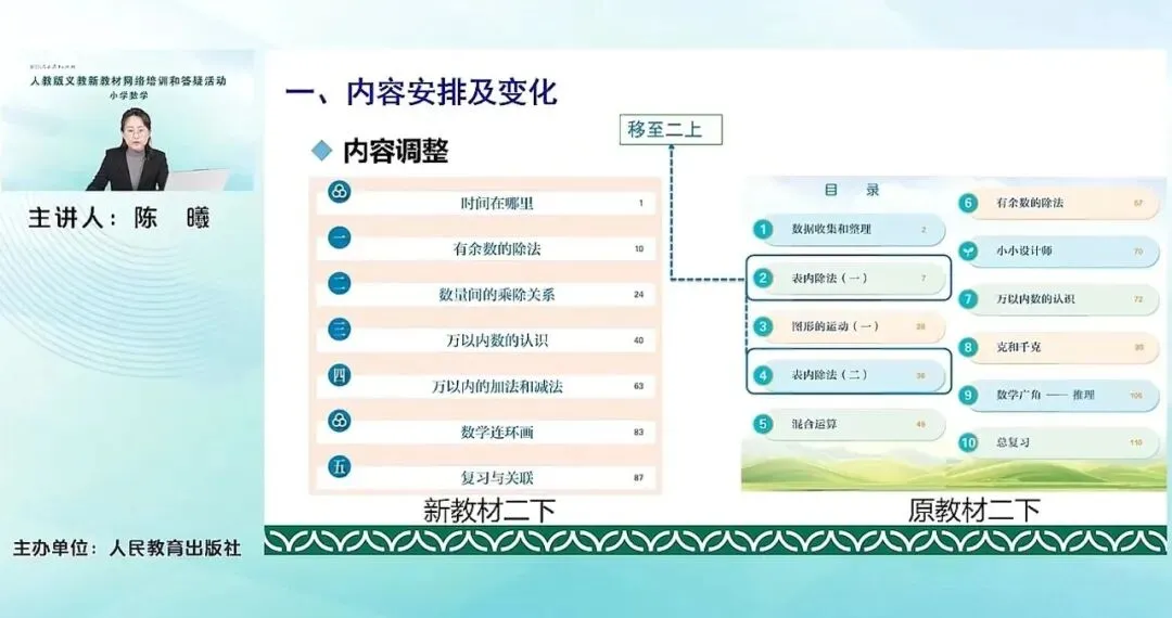 对比来看,我们原来修订前二年级下册的表内除法一、表内除法二,都已经移到了新教材的二年级上册,相信老师们都已经看到。而原来的混合运算、克和千克,移至新教材的三年级的上册。原来的数据收集整理,以及图形的运动(一)移至了新教材的三年级下册。