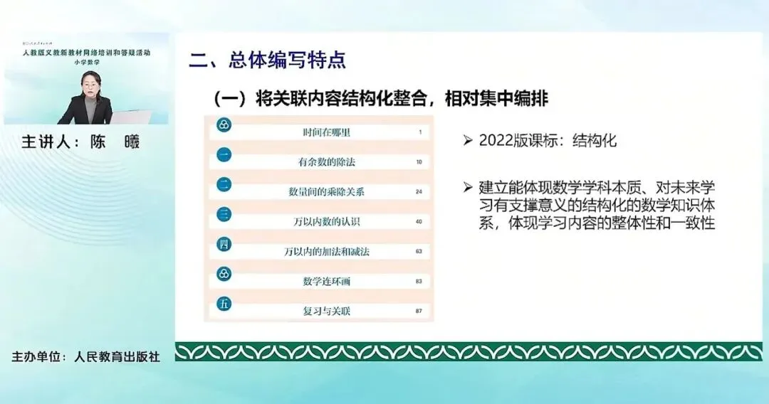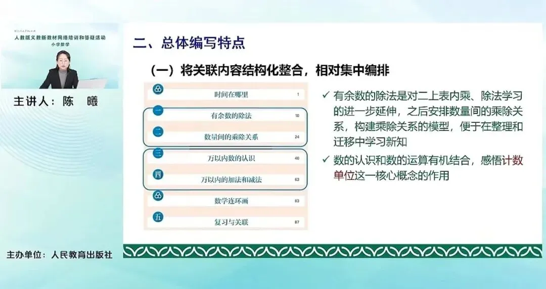 比如说我们这册教材属于代数领域下属的主题就整合的比较明显,充分的体现了学习内容的整体性和一致性。比如有余数的除法,对二上表内乘除法学习的这个进一步延伸的基础上,从本质上让学生看到能整除到不能整除的这个过程,它其实是对数的计算的进一步的扩展。在学习表内乘除法以及有余数除法的过程中,学生运用了运算的这个意义,解决了一些简单的实际问题。在这个基础上,教材及时安排数量间的乘除关系。通过理解倍的概念,在数量关系主题下构建乘除关系的模型。这样安排,从学科内容逻辑的角度来讲是顺的,也便于学生在整理和迁移中去学习新的知识。关联内容结构化还体现在数的认识和数的运算有机结合,将这两个相关联的内容一前一后的安排在这一册,以计数单位为核心,学习数的组成、数的读写法,以及加法、减法等等。让学生去体会不同计数单位之间的转化,感受十进制、位值制的思想。这和我们一年级下册百以内数的认识和百以内的口算、笔算先后编排,有机结合是类似的,帮助学生感受数的认识和数的运算之间的密切关系。这也体现了我们教材编排的整体性。