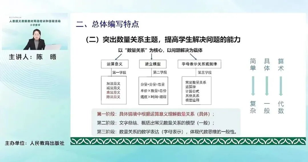 对于数量关系这一主题,本套教材是以数量关系主题为核心,以问题解决作为载体,大致分成了三个学段进行的。每个学段所要完成的数量关系的任务不一样。比如第一阶段,主要是在理解四则运算含义的基础上,在具体情境中根据运算意义理解数量关系。在第一个阶段学习的基础上,学生积累了一些具体的解决问题的经验。到了第二阶段,他们就需要利用文字去总结概括常见的数量关系的模型,比如我们这里提到的分量加分量等于总量,单价、数量、总价,以及速度、时间、路程这样常见的数量关系的模型。到了第三个阶段,就要通过用字母来表达数量关系和规律,去帮助学生感受代数的思维。可以发现我们这三个阶段基本上是从简单到复杂、从具体到一般、从算术啊到代数这么一个基本的过程。通过这三个阶段,学生对数量关系这一主题就会逐渐地进行掌握。