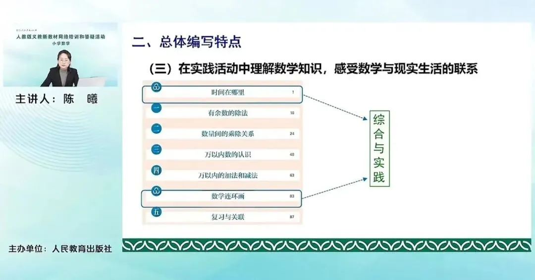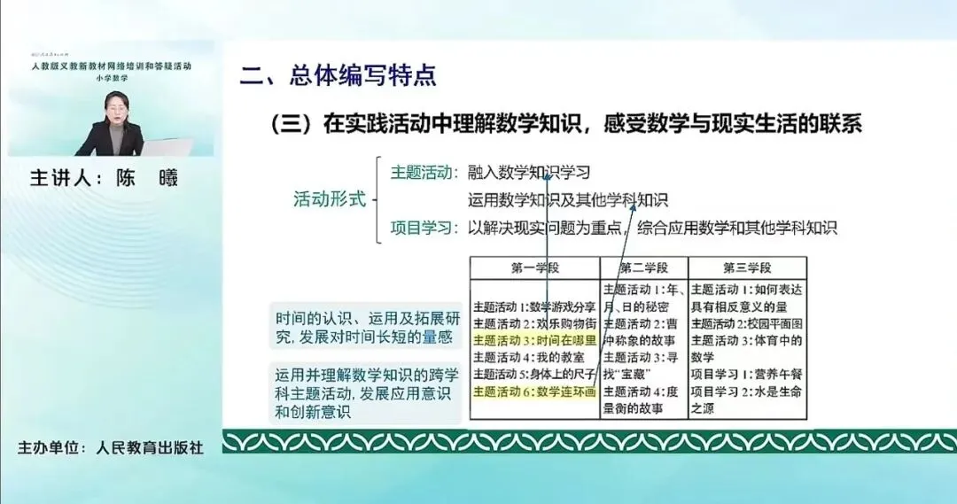 我们这册主要的综合实践领域的内容包含的就是课标里这里给出的学习时间的相关的主题活动。主要是在时间的认识、运用以及拓展研究中发展的对时间长短的变量。那本册的第二种综合实践活动是数学连环画,这也是课程标准中建议要求的一个活动,是运用理解数学知识啊进行的跨学科的主题活动。发展学生的应用意识和创新意识。