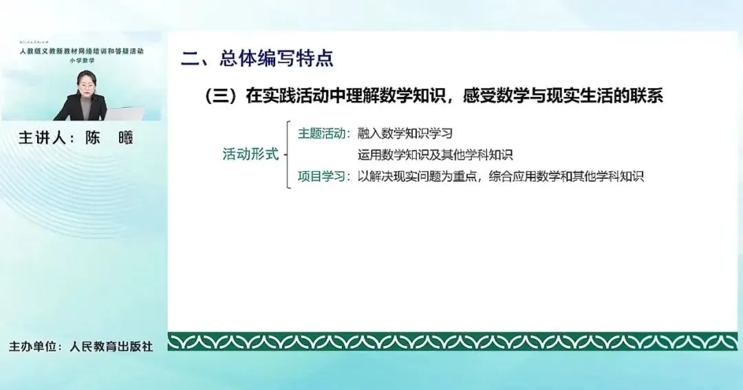 我们知道,在上一版的课标中,虽然将综合实践领域的这个内容与其他的数学知识内容领域并列,但并没有包含任何具体的知识点,也不承担任何新知学习的内容。前两版的课标中,对综合与实践内容都强调学生应用数学知识和其他学科知识来开展数学思考、实践、探究、交流等等活动,经历问题解决的过程,获得活动经验。而到了2022年版,这次课标不但延续了综合实践的这一定位,它还包含了一部分的新知的数学知识的这种学习。要求学生不但要学习这些知识,还要从实践探究等等活动的方式来对这些知识加以应用。所以总体来说,本套教材安排的综合实践活动并列于其他三个领域,并且它还包含了一些数学知识的学习,有的还是数学知识的应用,还有的是一些跨界学科的知识的融合。