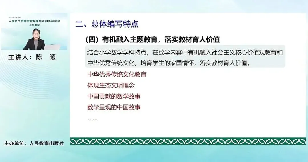 第四个整体的编写特点是有机融合了主题教育,落实教材的育人价值。我们结合小学数学学科的这个特点,在数学内容中有机的融入了社会主义核心价值观教育和中华优秀传统文化的教育,培育学生的家国情怀,落实教材的育人价值。全方位的体现我们国家的一些现代的科技成果、经济社会发展的成就。比如圭表。四轨、青铜漏壶、铜壶滴漏,这些我们中国的古代的计时工具,还有现代的,比如雪如意,还有我们近期在航空航天、轨道交通、基础设施建设等等各个领域取得的最新成果,作为我们数学知识的这种情境,帮助学生去了解我国社会主义发展、科学进步取得的最新成就,弘扬社会主义的先进文化。