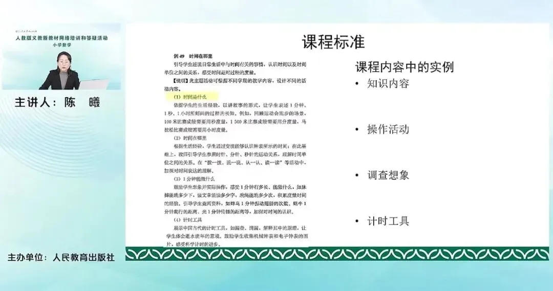 在课程标准当中就这一主题给出了一个实例,老师们可以看一看。课标已经给出了关于时间这一活动基本上可以从哪几个方面来进行展开?比如说第一个小活动可以从时间是什么,知识内容的角度去展开。第二个活动是操作活动,时间在哪里,让学生自由的去在钟点上拨一拨,进行一个拨认的环节。第三个小活动,比如说学生去感受操作一分钟能做些什么事情,进行调查和研究。最后是去认识我们国家,中国古代的计时工具,去了解科学的进步。