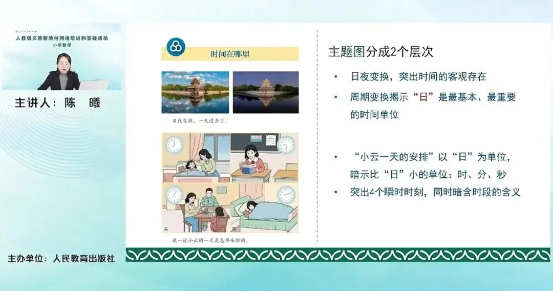 首先我们看一看主题图。主题图是有两个层次的。第一个层次主要是通过这样一个图片,从白天到黑夜的日夜变换,一天过去了,突出了时间的客观存在。因为时间本身相对而言是抽象的,它是看不见摸不着的,我们只有通过具体的周遭的一些事物的变化去感受到时间的这种客观存在。所以通过两张图片,让学生去感受时间的变换。其次,还有一个比较重要的点,就是突出了周期变换,就是“日”这个最基本的、最重要的时间单位。通过太阳一天升起落下,让孩子感受到一天,“日”这个概念其实是非常重要的一个时间单位。也是我们从小就能感受到的这个时间单位。那在“日”的基础上,那接下来以“日”为单位进行进一步的时间划分,就有时分秒比“日”小的时间单位。所以接下来,教材用小云一天的安排,这样的主题图去暗示这个更小的时间单位---时分秒。同时还突出了4个瞬时,早上的9:30,晚上的7点多一点,以及9点多一点,这样4个瞬时的时刻。其次,通过小云去做这些事情,也暗含了时间是一个过程的度量,它也可以表示一段时间,这样一个含义,通过这个主题图引入时间的学习。