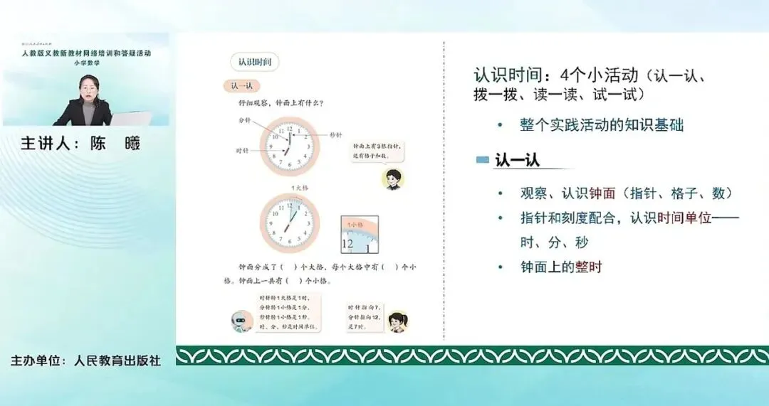 在每一个活动编排之下,又分别安排了几个小活动。比如认识时间,里面就包含了认识钟表,认识时与分分与秒之间的这种单位的进率,认识时刻。那我与时间的故事中,就包含了时长、时刻与时间之间的关系,建立时间的观念。我的时间小书,它里面就包含了除了去制作、分享我的时间小书,还有去解决一些和时间有关的简单问题。比如说求时长啊、求开始时间、经过时间等等。