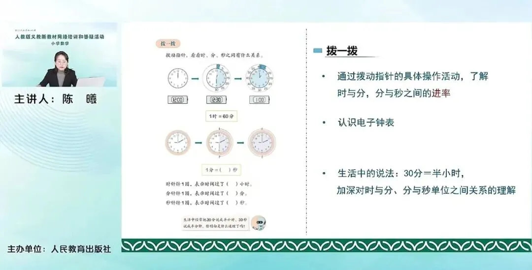 就是通过让学生自己去拨动指针进行一个具体的操作活动,去了解时与分,分与秒之间的单位之间的进率。同时配合电子钟表的认识,让学生进一步去感受时间、认识时间。除此之外,在本页教材的最后,老师可以看到,这个小机器人还有一句话,生活中经常把30分说成半小时,30秒说成半分钟。你明白是什么道理了吗?通过这种生活化的语言,让学生去感受我们时间单位和生活中的语言之间的关系,然后进一步去加深时间单位之间关系的理解。