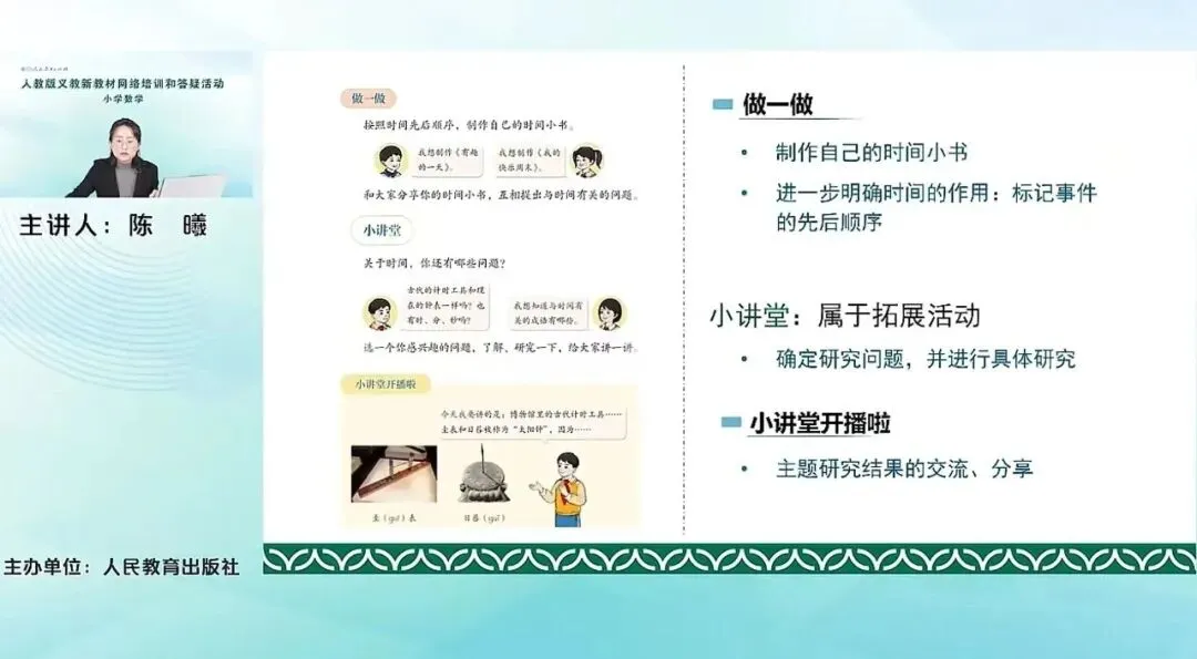 教材上对这个活动的编排,也基本上是按照刚才课标实例中给出的这个过程来进行展开的。主体活动是“制作一个我的时间小书”的一个主题活动,来进行一个主体的线索。那在这个主体的活动之前,就要进行活动的准备,也就是活动的引入,比如说怎么样引入时间学习这一内容,所以用主题图去引入情境。其次是关于时间究竟是什么,时间它怎么样来计量等等,通过活动的准备来进行展开。教材中通过两个环节,认识时间以及我与时间的故事,这两个小活动来展开。那在主体活动之后,还会有一个拓展延伸的环节,就是小讲堂,让学生自己去研究与时间有关的内容。然后进行一个知识拓展。把他研究的结果成果带到课堂上来,和同学一起分享。最后,还有一个反思评价的环节,帮助学生对自己这个活动中的表现,整体的进行一个反思。