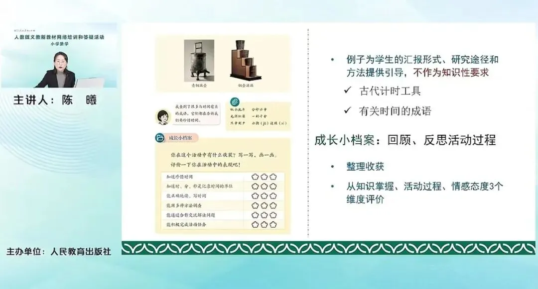 教材里给出了两个有关时间研究的成果,分别是与时间有关的古代的计时工具,以及与时间有关的成语。当然这里我们给出来的这个例子,不要求学生要去掌握,或者一定要知道这些。这里给出的仅仅是一个例子,汇报的这个实例。那具体的活动中,学生呈现出自己的汇报的成果,自己的研究的这个形式,自己的研究的方法,都可以在课堂上去展示。这里是不做知识性的这个要求的。重要的就是要进行这个活动本身,去积累活动的经验。
