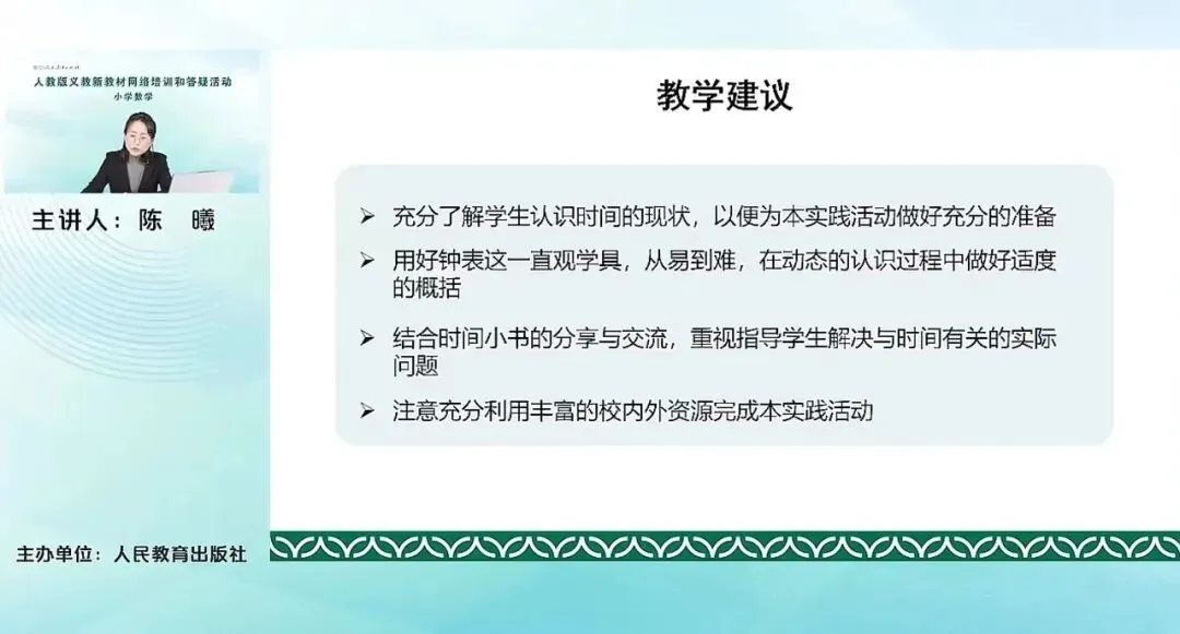 首先是充分了解学生认识时间的现状,以便为本实践活动做好充分的准备。在学生学习好这个活动之前,他们已经有很多关于时间的知识储备了。比如说他们可能已经知道一周有7天,每天的时间的大概的安排,老师们可以充分利用这些知识储备来进行活动。第二点就是用好钟表这么一个直观的学具。刚才我们也提到,其实时间对学生来说认识还是相对来说难一些。它本身是比较抽象的一个概念。钟表是能够让时时间的这么一个抽象给它具象化,能够直观化。所以老师们在实际的这个活动中,应该充分的利用钟表,让学生自己真正的去拨一拨、转一转。去感受时间单位之间的这种关系,去认读时间。因为时间本身它单位之间是60进制的啊,跟我们十进制的这个数是不太一样的,所以通过拨转这种具体的操作,能够让学生去从易到难的去进行学习。第三点,是结合时间小书的分享与交流,重视指导学生解决与时间有关的实际问题。对于学生来说,制作时间小书,分享交流可能都不是特别难,但是要让他通过自己去提出一些与时间有关的问题,然后自己去解决,可能会有一定的难度。在这方面,老师可以进行一些细致的指导。当然我们提倡不用提太难的时间的这个问题,基本上是经过时间或者求结束时间等等啊,一些比较简单的问题就可以了。最后是注意充分的利用丰富的校内校外的资源来完成本实践活动。如果有条件的学校可以组织一些参观博物馆,参观钟表馆,参观钟表厂等等。这些有趣的这些校内外的这个活动来进行,等时间活动。这样一个有意思的活动,我想学生的这个参与度会更高。