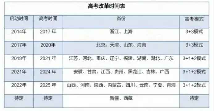 2017-至今,高考模式采用由最初的“3+3”模式过度到"3+1+2"模式且目前两种模式共存,很多省份实行“两依据一参考”(依据统一高考成绩和高中学业水平考试成绩,参考综合素质评价)的多元录取新模式。
