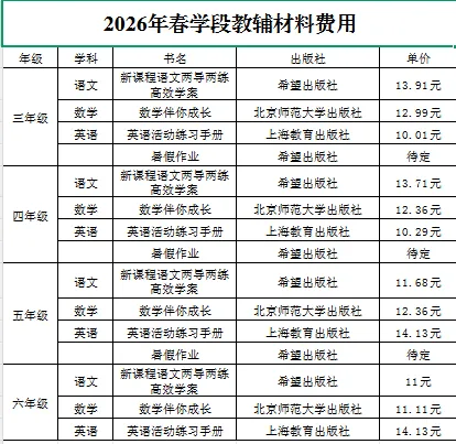 现对我校2026年春学段教材及教辅材料种类、出版社及费用明细予以公示,接受社会各界监督,旨在杜绝违规征订教辅材料行为,切实保障学生与家长的合法权益。具体如下: